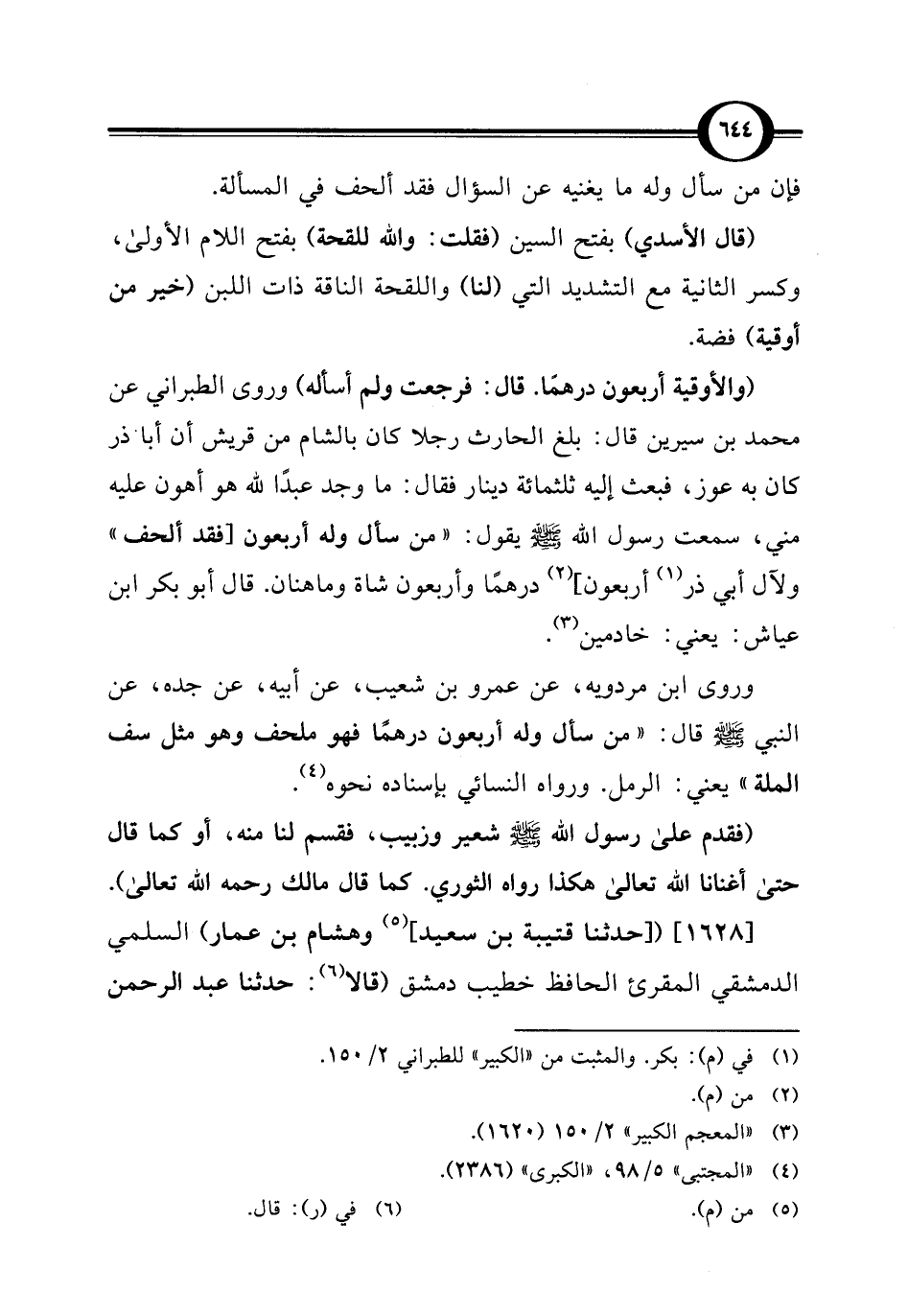 وروى ابن مردويه، عن عمرو بن شعيب، عن أبيه، عن جده، عن النبي - صلى الله عليه وسلم - قال: "من سأل وله أربعون درهمًا فهو ملحف وهو مثل سف الملة" يعني: الرمل. ورواه النسائي بإسناده نحوه (¬4).