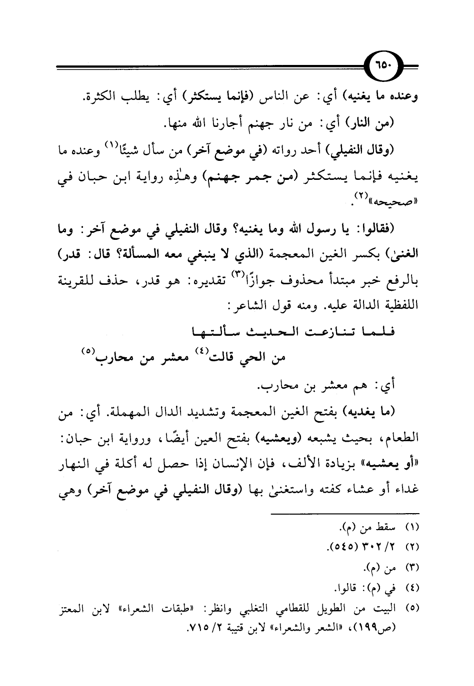 (فقالوا: يا رسول الله وما يغنيه؟ وقال النفيلي في موضع آخر: وما الغنى) بكسر الغين المعجمة (الذي لا ينبغي معه المسألة؟ قال: قدر) بالرفع خبر مبتدأ محذوف جوازًا (¬3) تقديره: هو قدر، حذف للقرينة اللفظية الدالة عليه. ومنه قول الشاعر:
