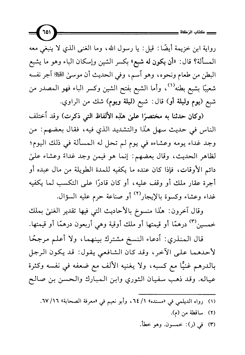 قال المنذري: ادعاء النسخ مشترك بينهما، ولا أعلم مرجحًا لأحدهما على الآخر، وقد كان الشافعي يقول: قد يكون الرجل بالدرهم غنيًّا مع كسبه، ولا يغنيه الألف مع ضعفه في نفسه وكثرة عياله. وقد ذهب سفيان الثوري وابن المبارك والحسن بن صالح