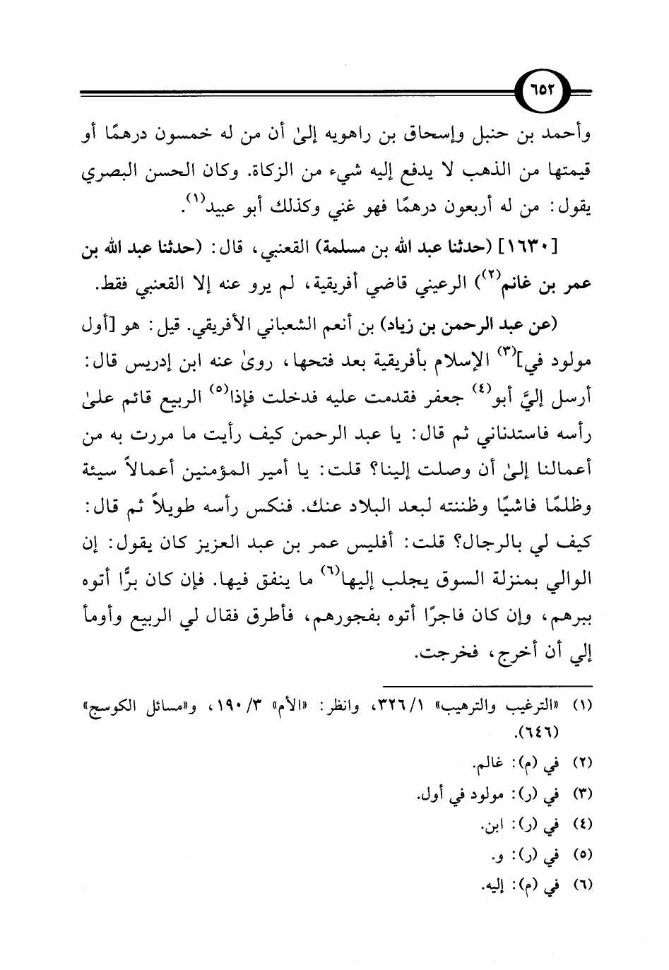 [1630] (حدثنا عبد الله بن مسلمة) القعنبي، قال: (حدثنا عبد الله بن عمر بن غانم) (¬2) الرعيني قاضي أفريقية، لم يرو عنه إلا القعنبي فقط.