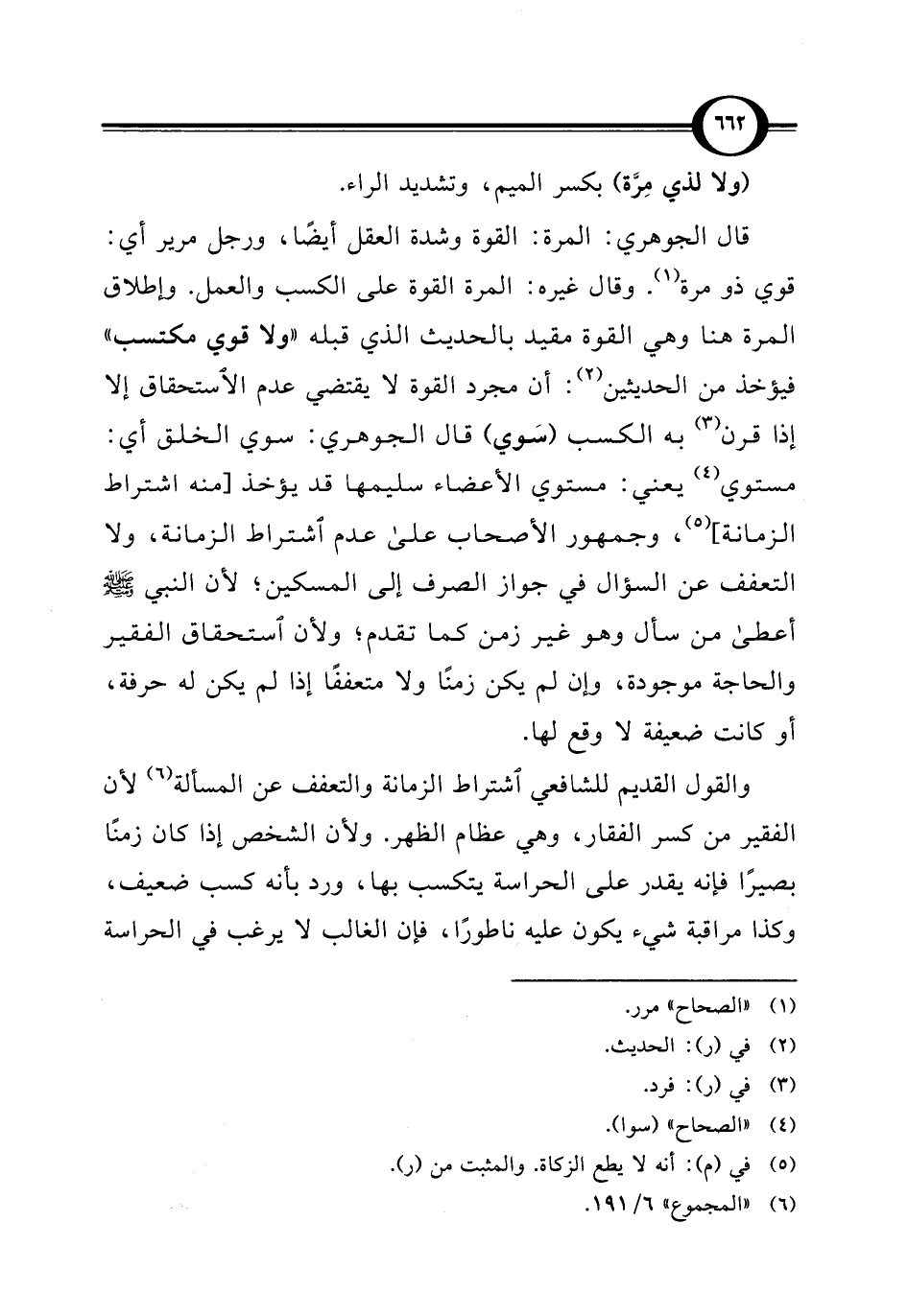 قال الجوهري: المرة: القوة وشدة العقل أيضًا، ورجل مرير أي: قوي ذو مرة (¬1). وقال غيره: المرة القوة على الكسب والعمل. وإطلاق المرة هنا وهي القوة مقيد بالحديث الذي قبله "ولا قوي مكتسب" فيؤخذ من الحديثين (¬2): أن مجرد القوة لا يقتضي عدم الاستحقاق إلا إذا قرن (¬3) به الكسب (سَوي) قال الجوهري: سوي الخلق أي: مستوي (¬4) يعني: مستوي الأعضاء سليمها قد يؤخذ [منه اشتراط الزمانة] (¬5)، وجمهور الأصحاب على عدم اشتراط الزمانة، ولا التعفف عن السؤال في جواز الصرف إلى المسكين؛ لأن النبي - صلى الله عليه وسلم - أعطى من سأل وهو غير زمن كما تقدم؛ ولأن استحقاق الفقير والحاجة موجودة، وإن لم يكن زمنًا ولا متعففًا إذا لم يكن له حرفة، أو كانت ضعيفة لا وقع لها.