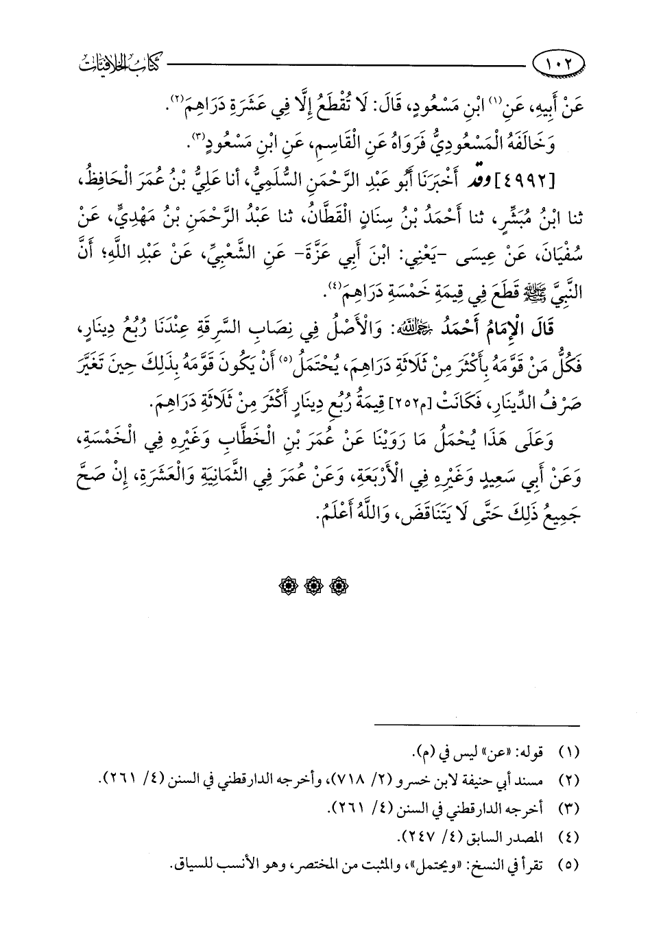 [4992] وقد أَخْبَرَنَا أَبُو عَبْدِ الرَّحْمَنِ السُّلَمِيُّ، أنا عَلِيُّ بْنُ عُمَرَ الْحَافِظُ، ثنا ابْنُ مُبَشِّرٍ، ثنا أَحْمَدُ بْنُ سِنَانٍ الْقَطَّانُ، ثنا عَبْدُ الرَّحْمَنِ بْنُ مَهْدِيٍّ، عَنْ سُفْيَانَ، عَنْ عِيسَى - يَعْنِي: ابْنَ أَبِي عَزَّةَ - عَنِ الشَّعْبِيِّ، عَنْ عَبْدِ اللَّهِ؛ أَنَّ النَّبِيَّ - صلى الله عليه وسلم - قَطَعَ فِي قِيمَةِ خَمْسَةِ دَرَاهِمَ (¬4).
