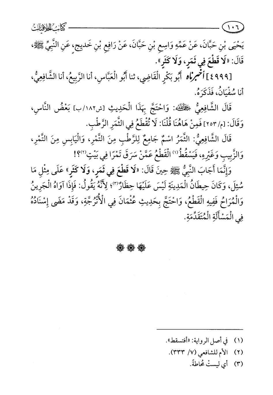 قَالَ الشَّافِعِيُّ - رحمه الله -: وَاحْتَجَّ بِهَذَا الْحَدِيثِ بَعْضُ النَّاسِ، وَقَالَ: فَمِنْ هَا هُنَا قُلْنَا: لَا تُقْطَعُ فِي الثَّمَرِ الرَّطْبِ.