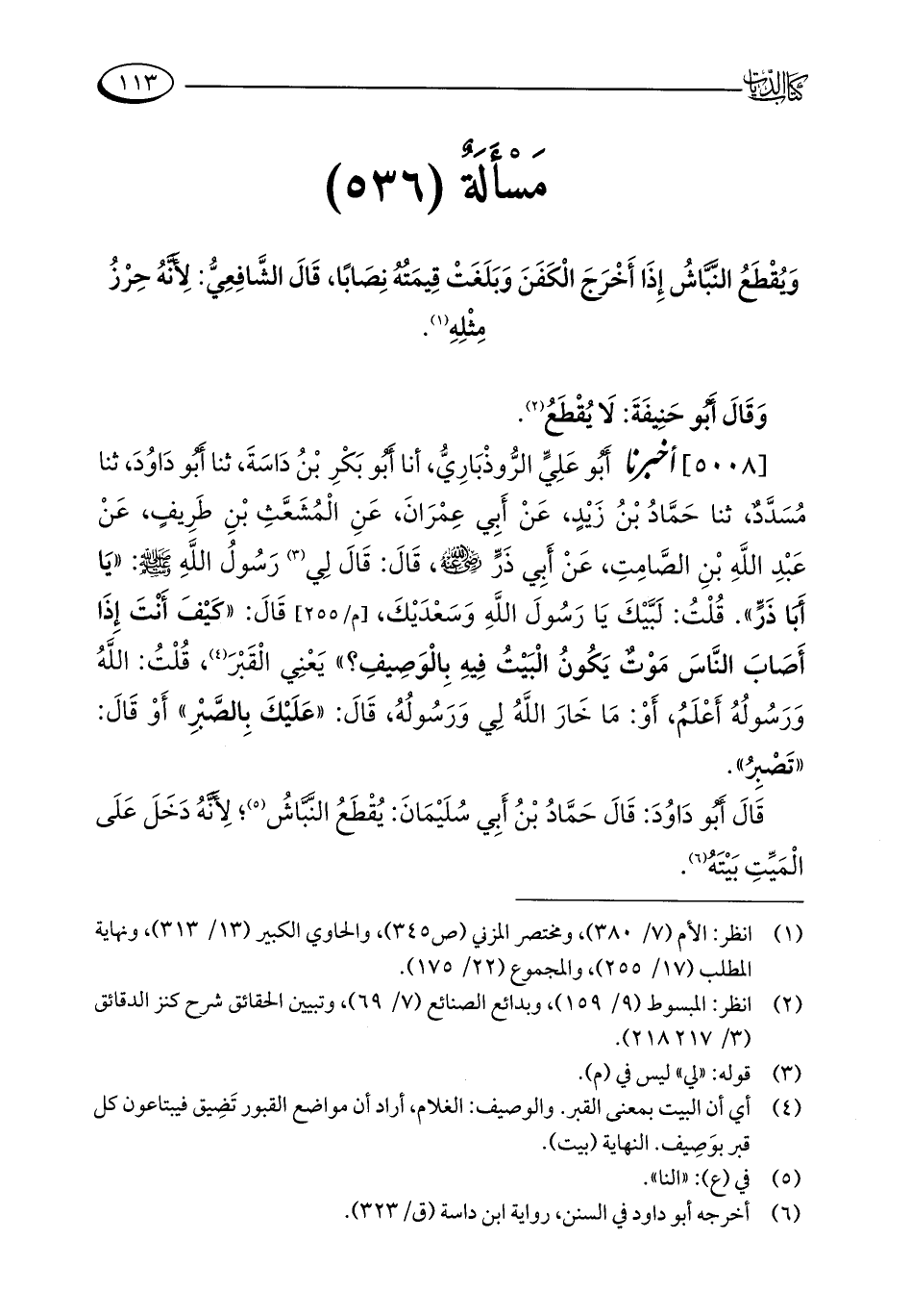 قَالَ أَبُو دَاوُدَ: قَالَ حَمَّادُ بْنُ أَبِي سُلَيْمَانَ: يُقْطَعُ النَّبَّاشُ (¬5)؛ لِأَنَّهُ دَخَلَ عَلَى الْمَيِّتِ بَيْتَهُ (¬6).