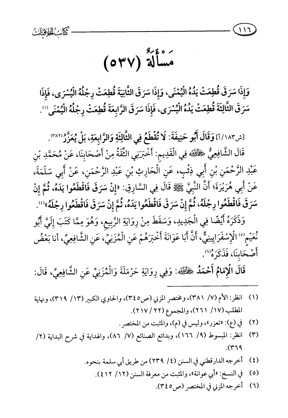 قَالَ الشَّافِعِيُّ - رحمه الله - فِي الْقَدِيمِ: أَخْبَرَنِي الثِّقَةُ مِنْ أَصْحَابِنَا، عَنْ مُحَمَّدِ بْنِ عَبْدِ الرَّحْمَنِ بْنِ أَبِي ذِئْبٍ، عَنِ الْحَارِثِ بْنِ عَبْدِ الرَّحْمَنِ، عَنْ أَبِي سَلَمَةَ، عَنْ أَبِي هُرَيْرَةَ؛ أَنَّ النَّبِيَّ - صلى الله عليه وسلم - قَالَ فِي السَّارِقِ: "إِنْ سَرَقَ فَاقْطَعُوا يَدَهُ، ثُمَّ إِنْ سَرَقَ فَاقْطَعُوا رِجْلَهُ، ثُمَّ إِنْ سَرَقَ فَاقْطَعُوا يَدَهُ، ثُمَّ إِنْ سَرَقَ فَاقْطَعُوا رِجْلَهُ" (¬4).