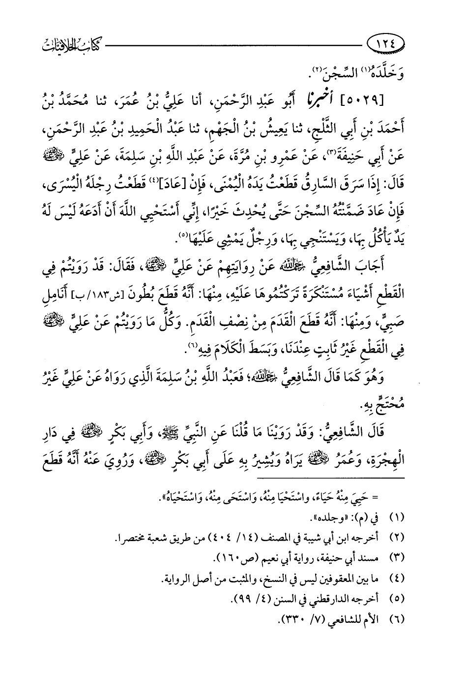 [5029] أخبرنا أَبُو عَبْدِ الرَّحْمَنِ، أنا عَلِيُّ بْنُ عُمَرَ، ثنا مُحَمَّدُ بْنُ أَحْمَدَ بْنِ أَبِي الثَّلْجِ، ثنا يَعِيشُ بْنُ الْجَهْمِ، ثنا عَبْدُ الْحَمِيدِ بْنُ عَبْدِ الرَّحْمَنِ، عَنْ أَبِي حَنِيفَةَ (¬3)، عَنْ عَمْرِو بْنِ مُرَّةَ، عَنْ عَبْدِ اللَّهِ بْنِ سَلِمَةَ، عَنْ عَلِيٍّ - رضي الله عنه - قَالَ: إِذَا سَرَقَ السَّارِقُ قَطَعْتُ يَدَهُ الْيُمْنَى، فَإِنْ [عَادَ] (¬4) قَطَعْتُ رِجْلَهُ الْيُسْرَى، فَإِنْ عَادَ ضَمَّنْتُهُ السِّجْنَ حَتَّى يُحْدِثَ خَيْرًا، إِنِّي أَسْتَحْيِي اللَّهَ أَنْ أَدَعَهُ لَيْسَ لَهُ يَدٌ يَأْكُلُ بِهَا، وَيَسْتَنْجِي بِهَا، وَرِجْلٌ يَمْشِي عَلَيْهَا (¬5).