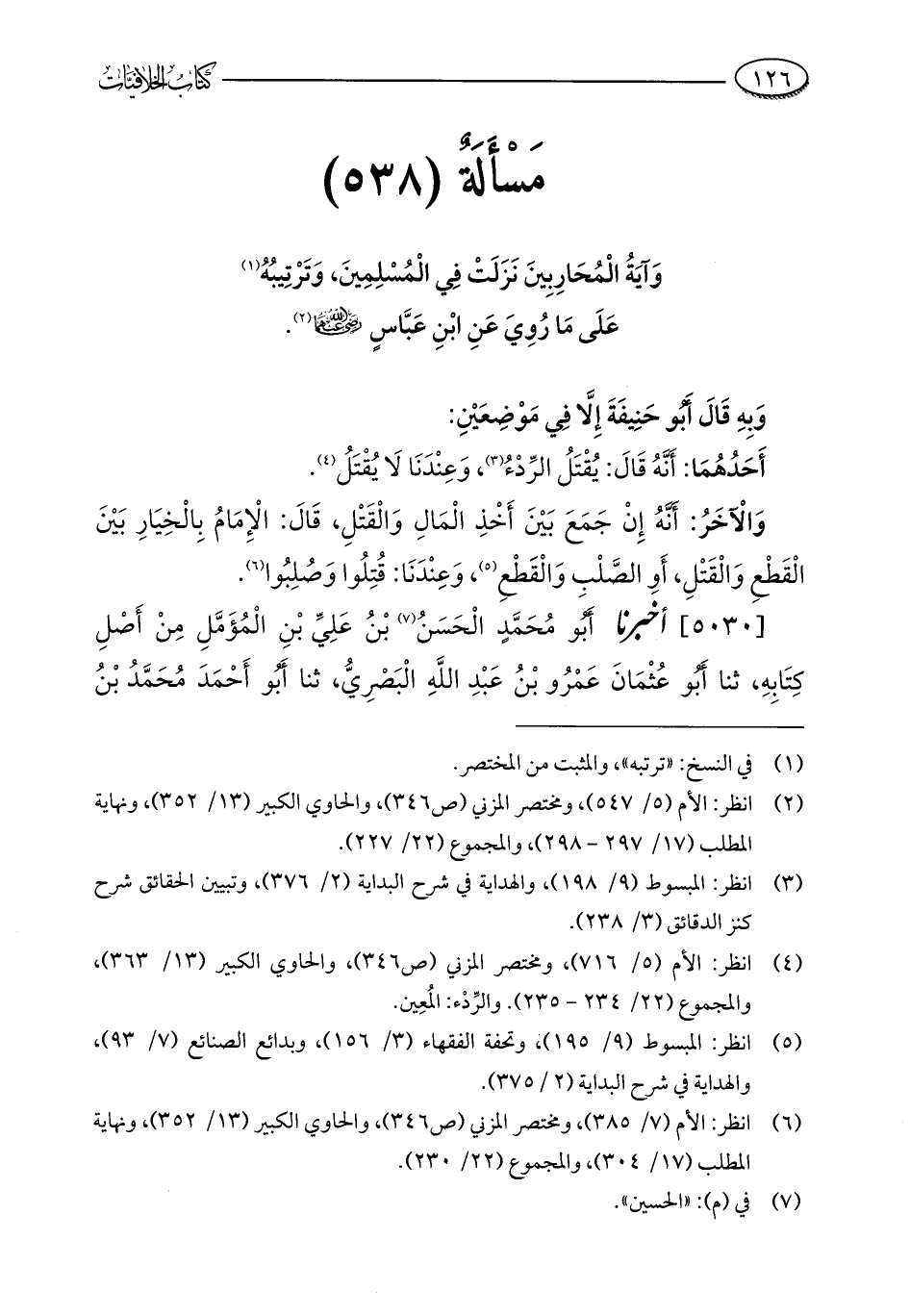 مَسْأَلَةٌ (538): وَآيَةُ الْمُحَارِبِينَ نَزَلَتْ فِي الْمُسْلِمِينَ، وَتَرْتِيبُهُ (¬1) عَلَى مَا رُوِيَ عَنِ ابْنِ عَبَّاسٍ - رضي الله عنهما - (¬2).