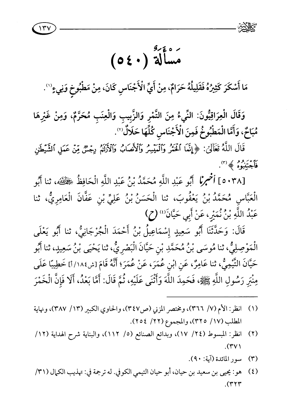 قَالَ: وَحَدَّثَنَا أَبُو سعِيدٍ إِسْمَاعِيلُ بْنُ أَحْمَدَ الْجُرْجَانِيُّ، ثنا أَبُو يَعْلَى الْمَوْصِلِيُّ، ثنا مُوسَى بْنُ مُحَمَّدِ بْنِ حَيَّانَ الْبَصْرِيُّ، ثنا يَحْيَى بْنُ سَعِيدٍ، ثنا أَبُو حَيَّانَ التَّيْمِيُّ، ثنا عَامِرٌ، عَنِ ابْنِ عُمَرَ، عَنْ عُمَرَ؛ أَنَّهُ قَامَ خَطِيبًا عَلَى مِنْبَرِ رَسُولِ اللَّهِ - صلى الله عليه وسلم -، فَحَمِدَ اللَّهَ وَأَثْنَى عَلَيْهِ، ثُمَّ قَالَ: أَمَّا بَعْدُ، أَلَا فَإِنَّ الْخَمْرَ