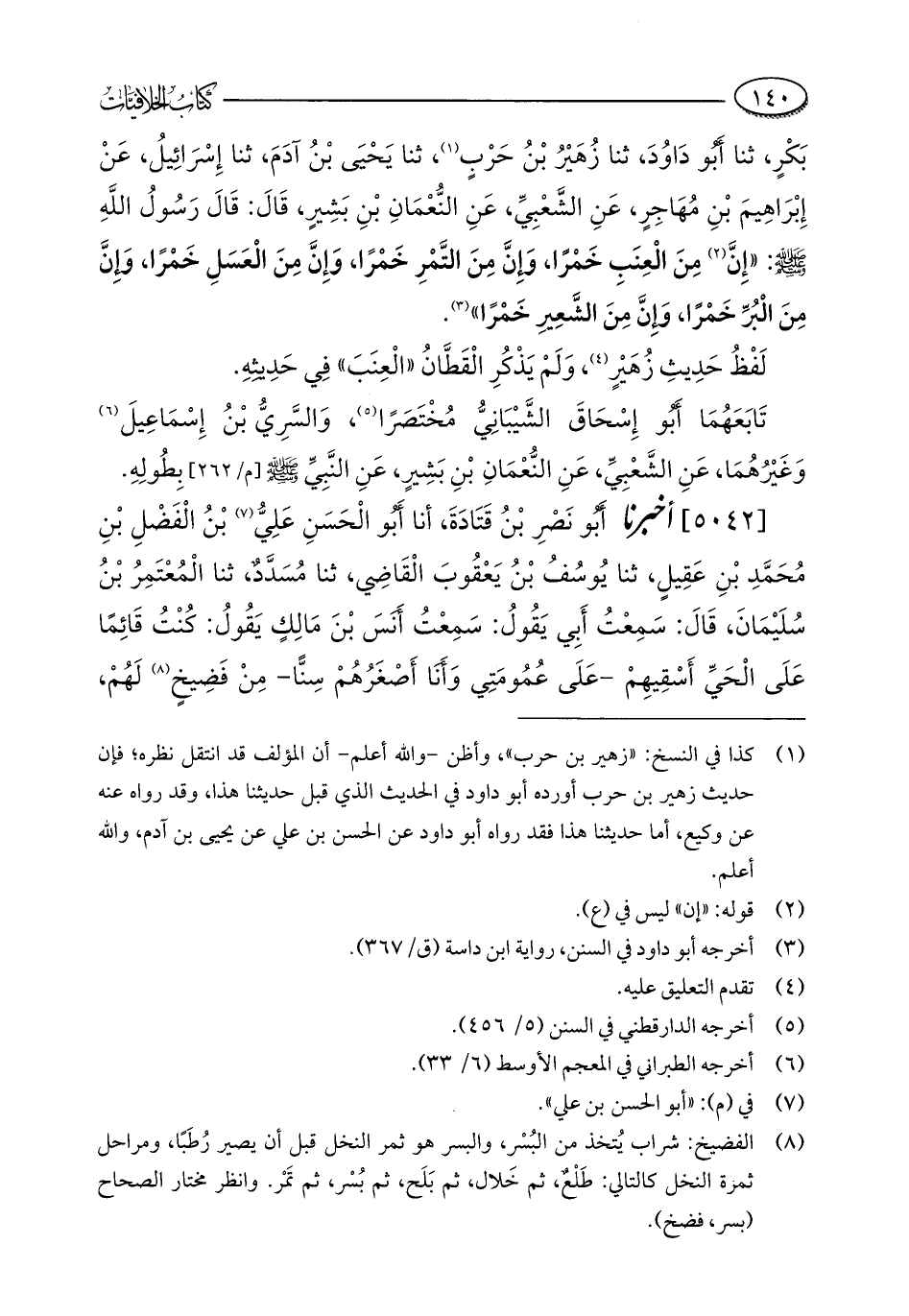 بَكْرٍ، ثنا أَبُو دَاوُدَ، ثنا زُهَيْرُ بْنُ حَرْبٍ (¬1)، ثنا يَحْيَى بْنُ آدَمَ، ثنا إِسْرَائِيلُ، عَنْ إِبْرَاهِيمَ بْنِ مُهَاجِرٍ، عَنِ الشَّعْبِيِّ، عَنِ النُّعْمَانِ بْنِ بَشِيرٍ، قَالَ: قَالَ رَسُولُ اللَّهِ - صلى الله عليه وسلم -: "إِنَّ (¬2) مِنَ الْعِنَبِ خَمْرًا، وَإِنَّ مِنَ التَّمْرِ خَمْرًا، وَإِنَّ مِنَ الْعَسَلِ خَمْرًا، وَإِنَّ مِنَ الْبُرِّ خَمْرًا، وَإِنَّ مِنَ الشَّعِيرِ خَمْرًا" (¬3).