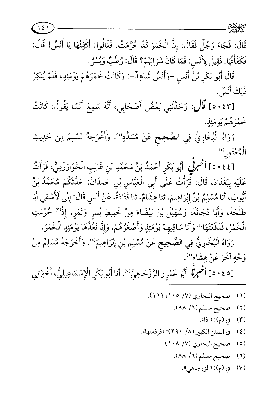 [5044] أخبرني أَبُو بَكْرٍ أَحْمَدُ بْنُ مُحَمَّدِ بْنِ غَالِبٍ الْخَوَارَزْمِيُّ، قَرَأْتُ عَلَيْهِ ببَغْدَادَ، قَالَ: قَرَأْتُ عَلَى أَبِي الْعَبَّاسِ بْنِ حَمْدَانَ: حَدَّثَكُمْ مُحَمَّدُ بْنُ أَيُّوبَ، أنا مُسْلِمُ بْنُ إِبْرَاهِيمَ، ثنا هِشامٌ، ثنا قَتَادَةُ، عَنْ أَنَسٍ قال: إِنِّي لَأَسْقِي أَبَا طَلْحَةَ، وَأَبَا دُجَانَةَ، وَسُهَيْلَ بْنَ بَيْضَاءَ مِنْ خَلِيطِ بُسْرٍ وَتَمْرٍ، إِذْ (¬3) حُرِّمَتِ الْخَمْرُ، فَدَفَعْتُهَا (¬4) وَأَنَا سَاقِيهِمْ يَوْمَئِذٍ وَأَصْغَرُهُمْ، وَإِنَّا نَعُدُّهَا يَوْمَئِذٍ الْخَمْرَ.