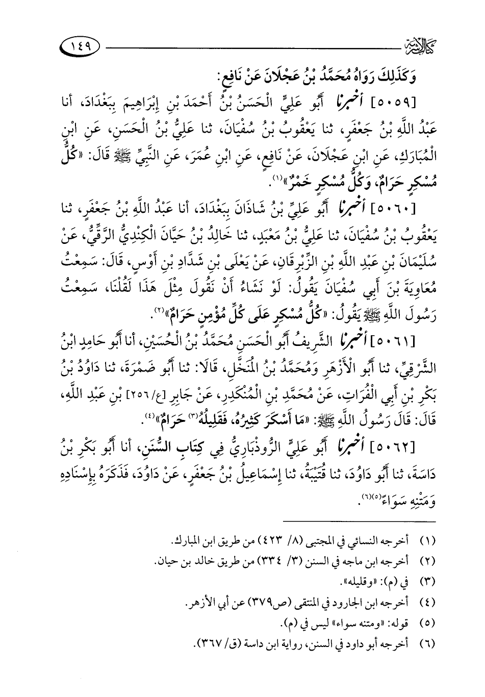[5059] أخبرنا أَبُو عَلِيٍّ الْحَسَنُ بْنُ أَحْمَدَ بْنِ إِبْرَاهِيمَ بِبَغْدَادَ، أنا عَبْدُ اللَّهِ بْنُ جَعْفَرٍ، ثنا يَعْقُوبُ بْنُ سُفْيَانَ، ثنا عَلِيُّ بْنُ الْحَسَنِ، عَنِ ابْنِ الْمُبَارَكِ، عَنِ ابْنِ عَجْلَانَ، عَنْ نَافِعٍ، عَنِ ابْنِ عُمَرَ، عَنِ النَّبِيِّ - صلى الله عليه وسلم - قَالَ: "كُلُّ مُسْكِرٍ حَرَامٌ، وَكُلُّ مُسْكِرٍ خَمْرٌ" (¬1).