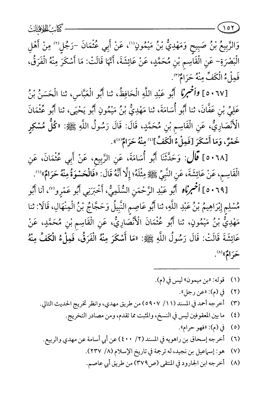 وَالرَّبِيعُ بْنُ صَبِيحٍ وَمَهْدِيُّ بْنُ مَيْمُونٍ (¬1)، عَنْ أَبِي عُثْمَانَ - رَجُلٍ (¬2) مِنْ أَهْلِ الْبَصْرَةِ - عَنِ الْقَاسِمِ بْنِ مُحَمَّدٍ، عَنْ عَائِشَةَ، أَنَّهَا قَالَتْ: مَا أَسْكَرَ مِنْهُ الْفَرَقُ، فَمِلْءُ الْكَفِّ مِنْهُ حَرَامٌ (¬3).