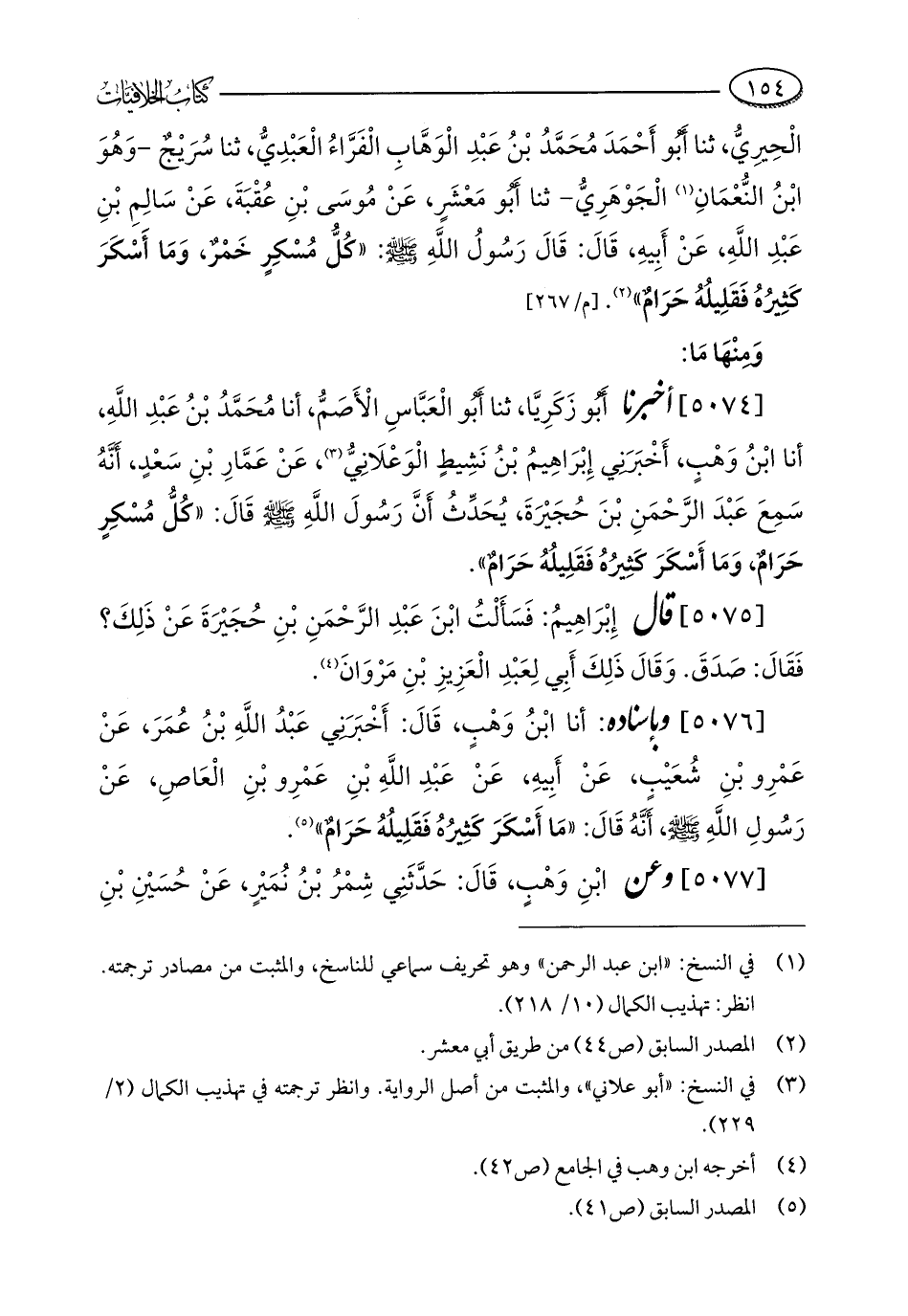 [5074] أخبرنا أَبُو زَكَرِيَّا، ثنا أَبُو الْعَبَّاسِ الْأَصَمُّ، أنا مُحَمَّدُ بْنُ عَبْدِ اللَّهِ، أنا ابْنُ وَهْبٍ، أَخْبَرَني إِبْرَاهِيمُ بْنُ نَشِيطٍ الْوَعْلَانِيُّ (¬3)، عَنْ عَمَّارِ بْنِ سَعْدٍ، أَنَّهُ سَمِعَ عَبْدَ الرَّحْمَنِ بْنَ حُجَيْرَةَ، يُحَدِّثُ أَنَّ رَسُولَ اللَّهِ - صلى الله عليه وسلم - قَالَ: "كُلُّ مُسْكِرٍ حَرَامٌ، وَمَا أَسْكَرَ كَثِيرُهُ فَقَلِيلُهُ حَرَامٌ".