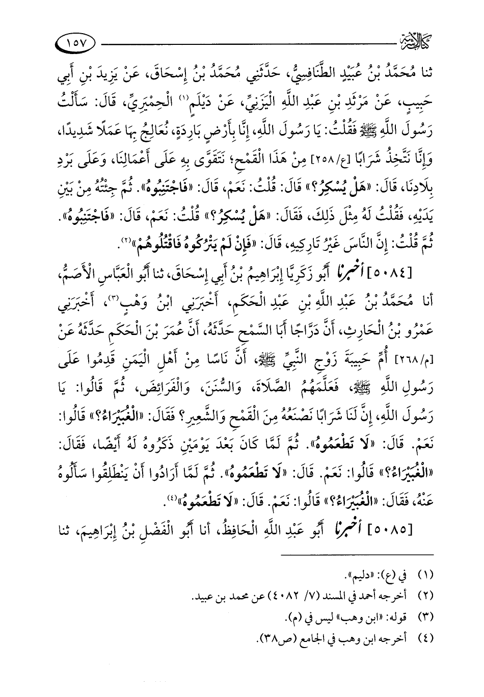 [5084] أخبرنا أَبُو زَكَرِيَّا إِبْرَاهِيمُ بْنُ أَبِي إِسْحَاقَ، ثنا أَبُو الْعَبَّاسِ الْأَصَمُّ، أنا مُحَمَّدُ بْنُ عَبْدِ اللَّهِ بْنِ عَبْدِ الْحَكَمِ، أَخْبَرَنِي ابْنُ وَهْبٍ (¬3)، أَخْبَرَنِي عَمْرُو بْنُ الْحَارِثِ، أَنَّ دَرَّاجًا أَبَا السَّمْحِ حَدَّثَهُ، أَنَّ عُمَرَ بْنَ الْحَكَمِ حَدَّثَهُ عَنْ أُمِّ حَبِيبَةَ زَوْجِ النَّبِيِّ - صلى الله عليه وسلم -، أَنَّ نَاسًا مِنْ أَهْلِ الْيَمَنِ قَدِمُوا عَلَى رَسُولِ اللَّهِ - صلى الله عليه وسلم -، فَعَلَّمَهُمُ الصَّلَاةَ، وَالسُّنَنَ، وَالْفَرَائِضَ، ثُمَّ قَالُوا: يَا رَسُولَ اللَّهِ، إِنَّ لَنَا شَرَابًا نَصْنَعُهُ مِنَ الْقَمْحِ وَالشَّعِيرِ؟ فَقَالَ: "الْغُبَيْرَاءُ؟ " قَالُوا: نَعَمْ. قَالَ: "لَا تَطْعَمُوهُ". ثُمَّ لَمَّا كَانَ بَعْدَ يَوْمَيْنِ ذَكَرُوهُ لَهُ أَيْضًا، فَقَالَ: "الْغُبَيْرَاءُ؟ " قَالُوا: نَعَمْ. قَالَ: "لَا تَطْعَمُوهُ". ثُمَّ لَمَّا أَرَادُوا أَنْ يَنْطَلِقُوا سَأَلُوهُ عَنْهُ، فَقَالَ: "الْغُبَيْرَاءُ؟ " قَالُوا: نَعَمْ. قَالَ: "لَا تَطْعَمُوهُ" (¬4).