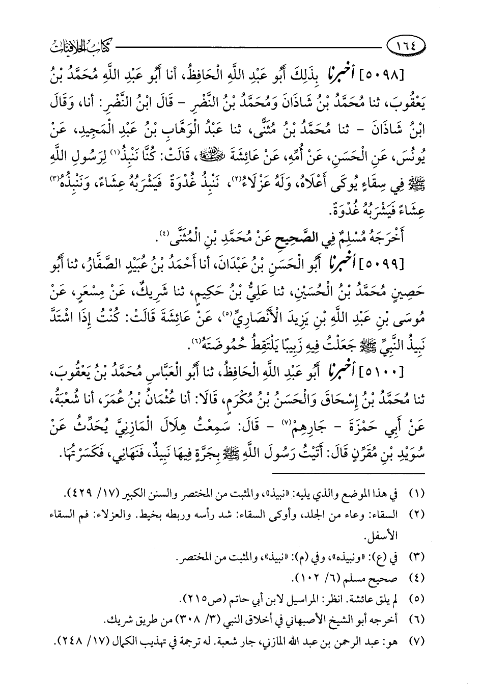 [5098] أخبرنا بِذَلِكَ أَبُو عَبْدِ اللَّهِ الْحَافِظُ، أنا أَبُو عَبْدِ اللَّهِ مُحَمَّدُ بْنُ يَعْقُوبَ، ثنا مُحَمَّدُ بْنُ شَاذَانَ وَمُحَمَّدُ بْنُ النَّضْرِ - قَالَ ابْنُ النَّضْرِ: أنا، وَقَالَ ابْنُ شَاذَانَ - ثنا مُحَمَّدُ بْنُ مُثَنًّى، ثنا عَبْدُ الْوَهَّابِ بْنُ عَبْدِ الْمَجِيدِ، عَنْ يُونُسَ، عَنِ الْحَسَنِ، عَنْ أُمِّهِ، عَنْ عَائِشَةَ - رضي الله عنها -، قَالَتْ: كُنَّا نَنْبِذُ (¬1) لِرَسُولِ اللَّهِ - صلى الله عليه وسلم - في سِقَاءٍ يُوكَى أَعْلَاهُ، وَلَهُ عَزْلَاءُ (¬2)، نَنْبِذُ غُدْوَةً فَيَشْرَبُهُ عِشَاءً، وَنَنْبِذُهُ (¬3) عِشَاءً فَيَشْرَبُهُ غُدْوَةً.