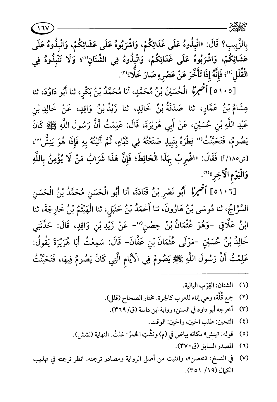 [5105] أخبرنا الْحُسَيْنُ بْنُ مُحَمَّدٍ، أنا مُحَمَّدُ بْنُ بَكْرٍ، ثنا أَبُو دَاوُدَ، ثنا هِشَامُ بْنُ عَمَّارٍ، ثنا صَدَقَةُ بْنُ خَالِدٍ، ثنا زيدُ بْنُ وَاقِدٍ، عَنْ خَالِدِ بْنِ عَبْدِ اللَّهِ بْنِ حُسَيْنٍ، عَنْ أَبِي هُرَيْرَةَ، قَالَ: عَلِمْتُ أَنَّ رَسُولَ اللَّهِ - صلى الله عليه وسلم - كَانَ يَصُومُ، فَتَحَيَّنْتُ (¬4) فِطْرَهُ بِنَبِيذٍ صَنَعْتُهُ فِي دُبَّاءٍ، ثُمَّ أَتَيْتُهُ بِهِ فَإِذَا هُوَ يَنِشُّ (¬5)، فَقَالَ: "اضْرِبْ بِهَذَا الْحَائِطَ؛ فَإِنَّ هَذَا شَرَابُ مَنْ لَا يُؤْمِنُ بِاللَّهِ وَالْيَوْمِ الْآخِرِ" (¬6).