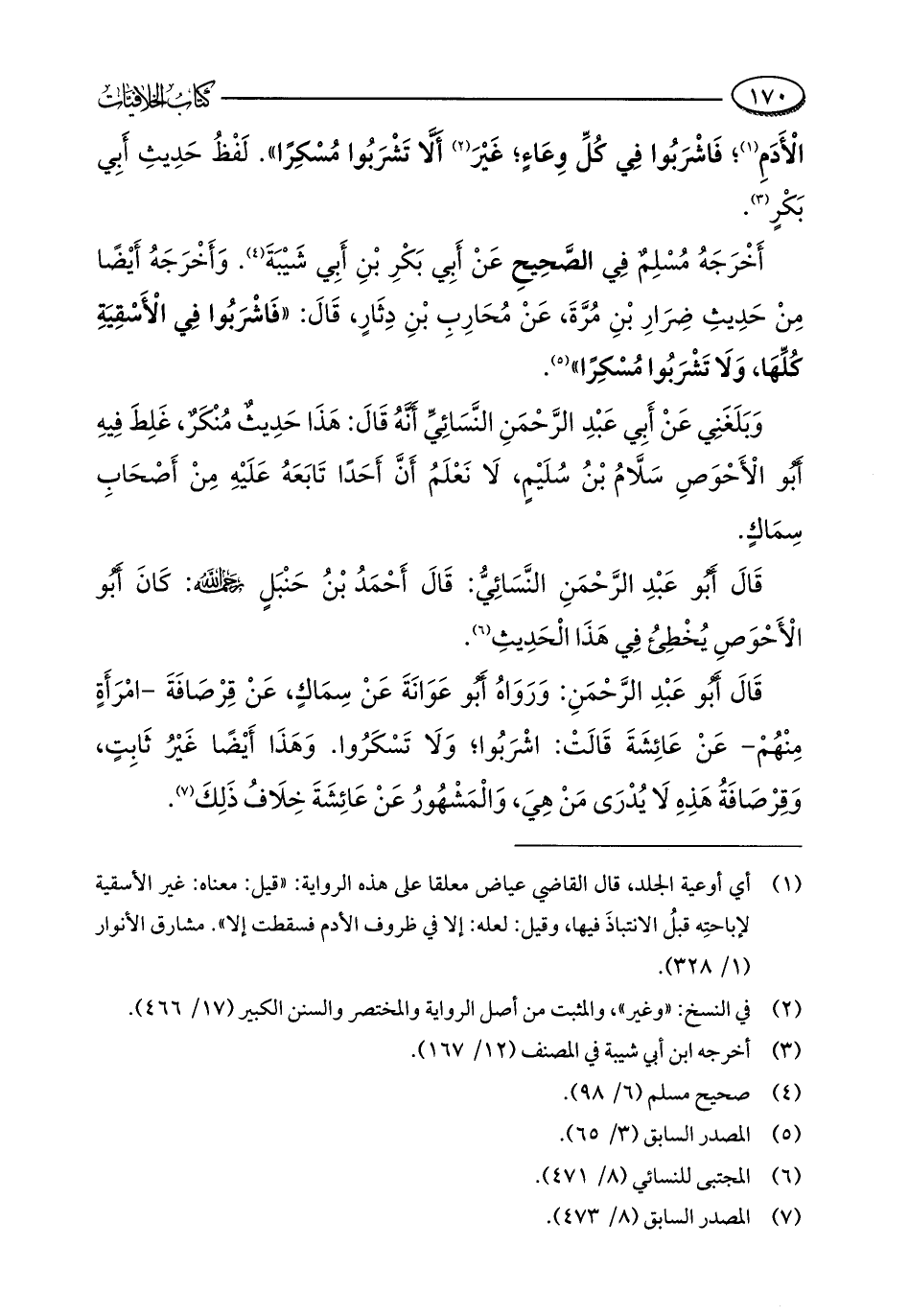 أَخْرَجَهُ مُسْلِمٌ فِي الصَّحِيحِ عَنْ أَبِي بَكْرِ بْنِ أَبِي شَيْبَةَ (¬4). وَأَخْرَجَهُ أَيْضًا مِنْ حَدِيثِ ضِرَارِ بْنِ مُرَّةَ، عَنْ مُحَارِبِ بْنِ دِثَارٍ، قَالَ: "فَاشْرَبُوا فِي الْأَسْقِيَةِ كُلِّهَا، وَلَا تَشْرَبُوا مُسْكِرًا" (¬5).