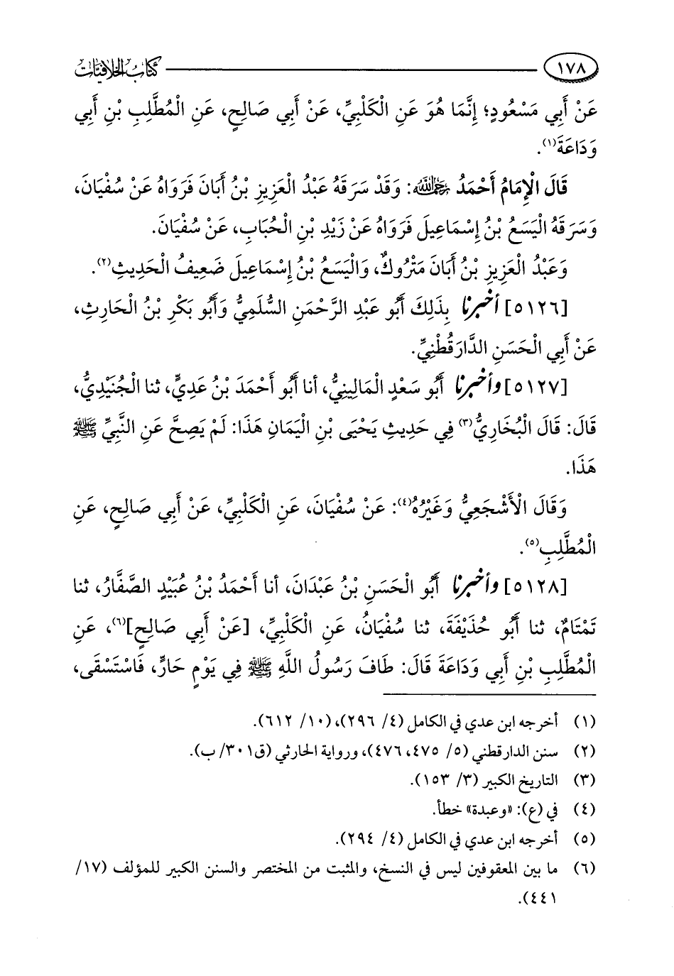 عَنْ أَبِي مَسْعُودٍ؛ إِنَّمَا هُوَ عَنِ الْكَلْبِيِّ، عَنْ أَبِي صَالِحٍ، عَنِ الْمُطَّلِبِ بْنِ أَبِي وَدَاعَةَ (¬1).
