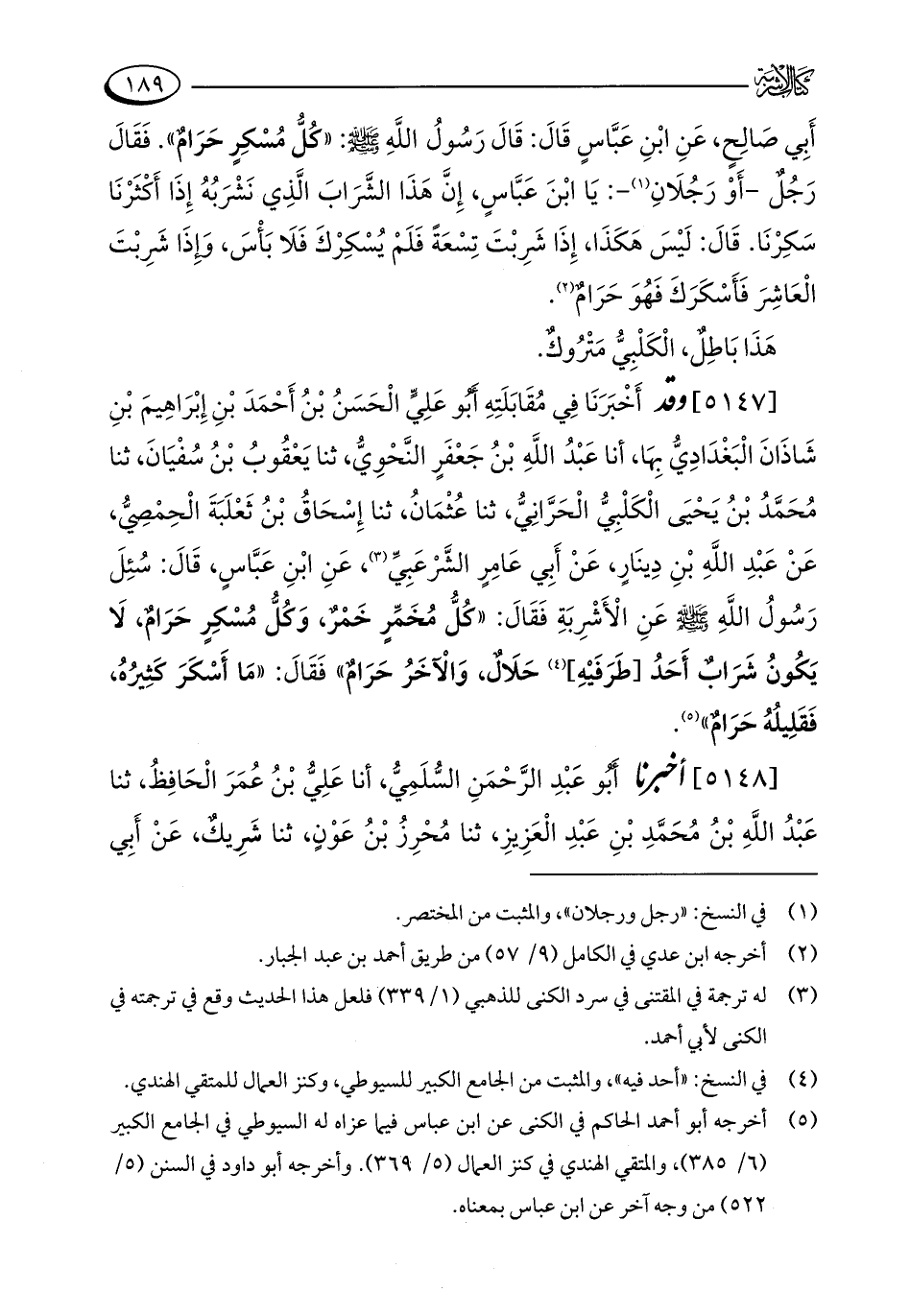 [5147] وقد أَخْبَرَنَا فِي مُقَابَلَتِهِ أَبُو عَلِيٍّ الْحَسَنُ بْنُ أَحْمَدَ بْنِ إِبْرَاهِيمَ بْنِ شَاذَانَ الْبَغْدَادِيُّ بِهَا، أنا عَبْدُ اللَّهِ بْنُ جَعْفَرٍ النَّحْوِيُّ، ثنا يَعْقُوبُ بْنُ سُفْيَانَ، ثنا مُحَمَّدُ بْنُ يَحْيَى الْكَلْبِيُّ الْحَرَّانِيُّ، ثنا عُثْمَانُ، ثنا إِسْحَاقُ بْنُ ثَعْلَبَةَ الْحِمْصِيُّ، عَنْ عَبْدِ اللَّهِ بْنِ دِينَارٍ، عَنْ أَبِي عَامِرٍ الشَّرْعَبِيِّ (¬3)، عَنِ ابْنِ عَبَّاسٍ، قَالَ: سُئِلَ رَسُولُ اللَّهِ - صلى الله عليه وسلم - عَنِ الْأَشْرِبَةِ فَقَالَ: "كُلُّ مُخَمِّرٍ خَمْرٌ، وَكُلُّ مُسْكِرٍ حَرَامٌ، لَا يَكُونُ شَرَابٌ أَحَدُ [طَرَفَيْهِ] (¬4) حَلَالٌ، وَالْآخَرُ حَرَامٌ" فَقَالَ: "مَا أَسْكَرَ كَثِيرُهُ، فَقَلِيلُهُ حَرَامٌ" (¬5).