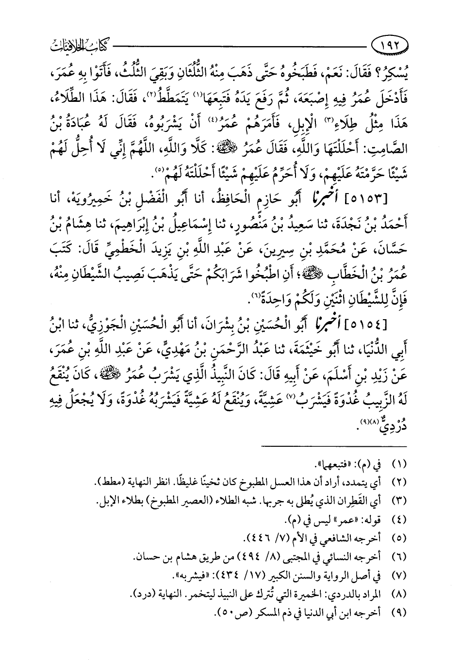 [5153] أخبرنا أَبُو حَازِمٍ الْحَافِظُ، أنا أَبُو الْفَضْلِ بْنُ خَمِيرُويَهْ، أنا أَحْمَدُ بْنُ نَجْدَةَ، ثنا سَعِيدُ بْنُ مَنْصُورٍ، ثنا إِسْمَاعِيلُ بْنُ إِبْرَاهِيمَ، ثنا هِشَامُ بْنُ حَسَّانَ، عَنْ مُحَمَّدِ بْنِ سِيرِينَ، عَنْ عَبْدِ اللَّهِ بْنِ يَزِيدَ الْخَطْمِيِّ قَالَ: كَتَبَ عُمَرُ بْنُ الْخَطَّابِ - رضي الله عنه -؛ أَنِ اطْبُخُوا شَرَابَكُمْ حَتَّى يَذْهَبَ نَصِيبُ الشَّيْطَانِ مِنْهُ، فَإِنَّ لِلشَّيْطَانِ اثْنَيْنِ وَلَكُمْ وَاحِدَةً (¬6).