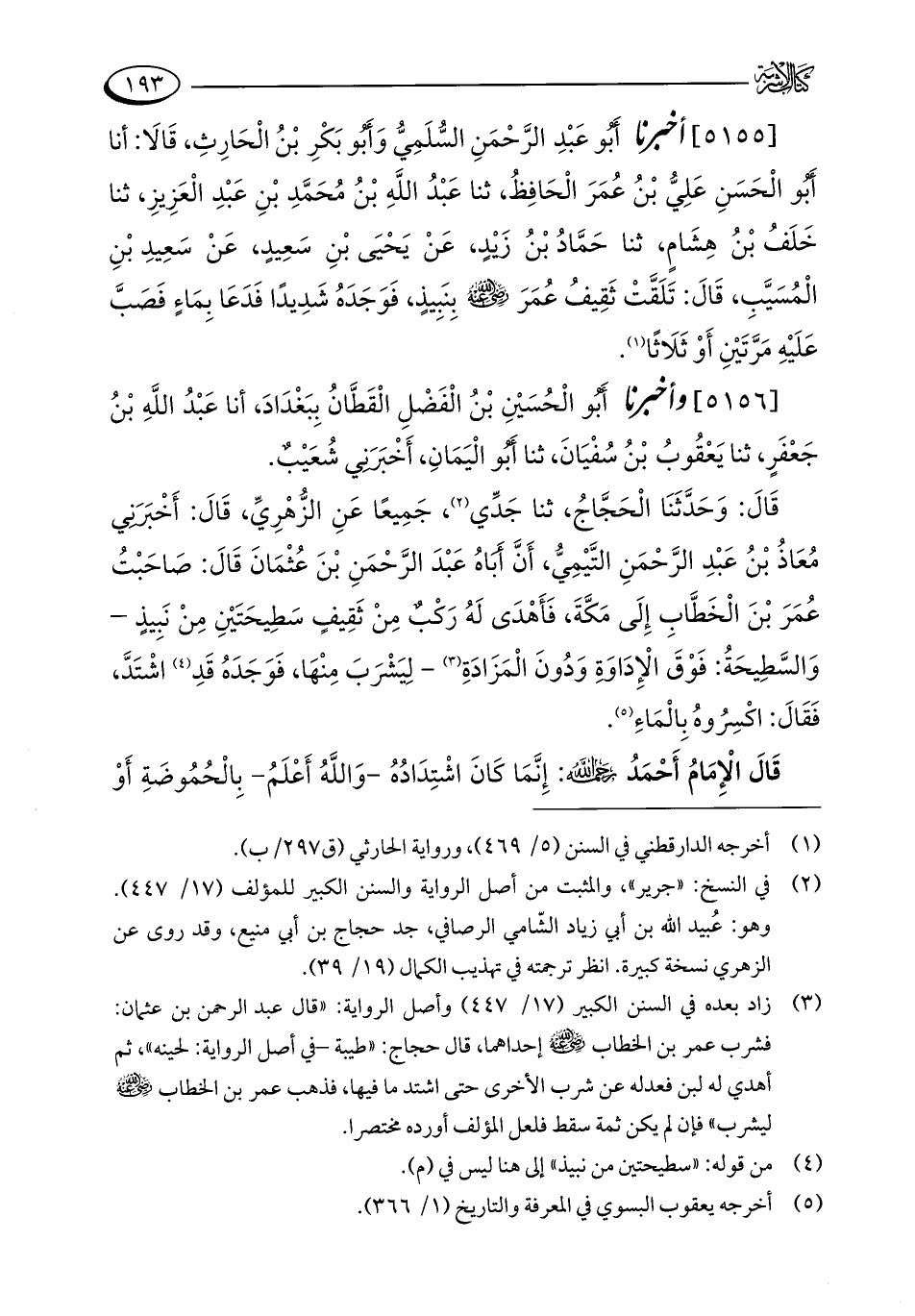 [5155] أخبرنا أَبُو عَبْدِ الرَّحْمَنِ السُّلَمِيُّ وَأَبُو بَكْرِ بْنُ الْحَارِثِ، قَالَا: أنا أَبُو الْحَسَنِ عَلِيُّ بْنُ عُمَرَ الْحَافِظُ، ثنا عَبْدُ اللَّهِ بْنُ مُحَمَّدِ بْنِ عَبْدِ الْعَزِيزِ، ثنا خَلَفُ بْنُ هِشَامٍ، ثنا حَمَّادُ بْنُ زَيْدٍ، عَنْ يَحْيَى بْنِ سَعِيدٍ، عَنْ سَعِيدِ بْنِ الْمُسَيَّبِ، قَالَ: تَلَقَّتْ ثَقِيفُ عُمَرَ - رضي الله عنه - بِنَبِيذٍ، فَوَجَدَهُ شَدِيدًا فَدَعَا بِمَاءٍ فَصَبَّ عَلَيْهِ مَرَّتَيْنِ أَوْ ثَلَاثًا (¬1).