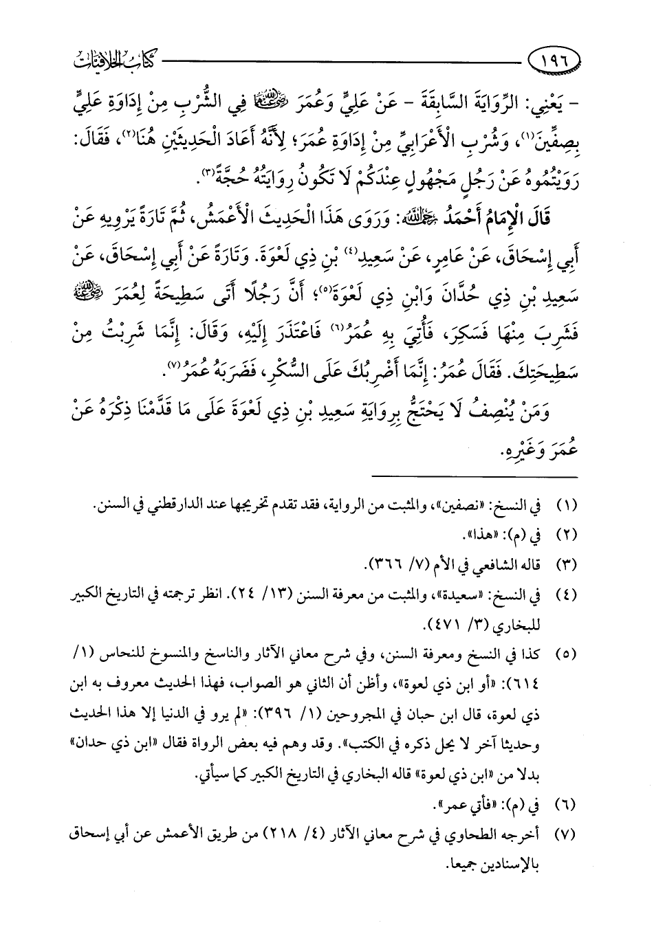 قَالَ الْإِمَامُ أَحْمَدُ - رحمه الله -: وَرَوَى هَذَا الْحَدِيثَ الْأَعْمَشُ، ثُمَّ تَارَةً يَرْوِيهِ عَنْ أَبِي إِسْحَاقَ، عَنْ عَامِرٍ، عَنْ سَعِيدِ (¬4) بْنِ ذِي لَعْوَةَ. وَتَارَةً عَنْ أَبِي إِسْحَاقَ، عَنْ سَعِيدِ بْنِ ذِي حُدَّانَ وَابْنِ ذِي لَعْوَةَ (¬5)؛ أَنَّ رَجُلًا أَتَى سَطِيحَةً لِعُمَرَ - رضي الله عنه - فَشَرِبَ مِنْهَا فَسَكِرَ، فَأُتِيَ بِهِ عُمَرُ (¬6) فَاعْتَذَرَ إِلَيْهِ، وَقَالَ: إِنَّمَا شَرِبْتُ مِنْ سَطِيحَتِكَ. فَقَالَ عُمَرُ: إِنَّمَا أَضْرِبُكَ عَلَى السُّكْرِ، فَضَرَبَهُ عُمَرُ (¬7).