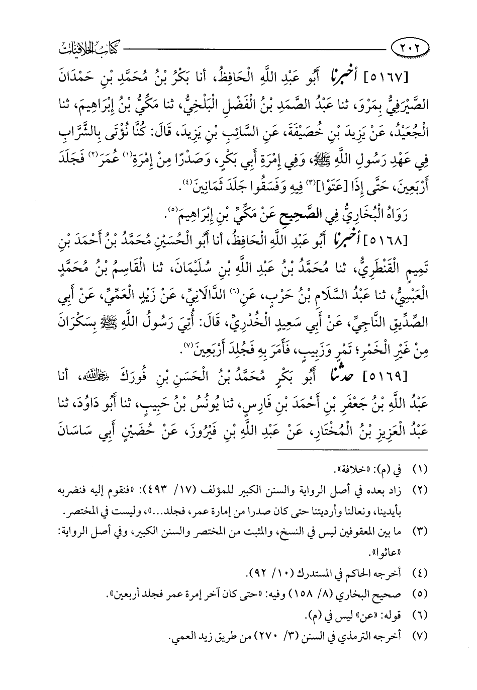 [5167] أخبرنا أَبُو عَبْدِ اللَّهِ الْحَافِظُ، أنا بَكْرُ بْنُ مُحَمَّدِ بْنِ حَمْدَانَ الصَّيْرَفِيُّ بِمَرْوَ، ثنا عَبْدُ الصَّمَدِ بْنُ الْفَضْلِ الْبَلْخِيُّ، ثنا مَكِّيُّ بْنُ إِبْرَاهِيمَ، ثنا الْجُعَيْدُ، عَنْ يَزِيدَ بْنِ خُصَيْفَةَ، عَنِ السَّائِبِ بْنِ يَزِيدَ، قَالَ: كُنَّا نُؤْتَى بِالشَّرَّابِ فِي عَهْدِ رَسولِ اللَّهِ - صلى الله عليه وسلم -، وَفِي إِمْرَةِ أَبِي بَكْرٍ، وَصَدْرًا مِنْ إِمْرَةِ (¬1) عُمَرَ (¬2) فَجَلَدَ أَرْبَعِينَ، حَتَّى إِذَا [عَتَوْا] (¬3) فِيهِ وَفَسَقُوا جَلَدَ ثَمَانِينَ (¬4).