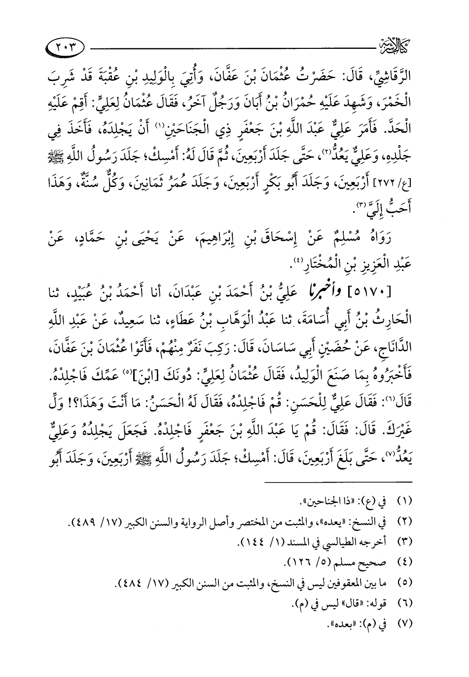 الرَّقَاشِيِّ، قَالَ: حَضَرْتُ عُثْمَانَ بْنَ عَفَّانَ، وَأُتِيَ بِالْوَلِيدِ بْنِ عُقْبَةَ قَدْ شَرِبَ الْخَمْرَ، وَشَهِدَ عَلَيْهِ حُمْرَانُ بْنُ أَبَانَ وَرَجُلٌ آخَرُ، فَقَالَ عُثْمَانُ لِعَلِيٍّ: أَقِمْ عَلَيْهِ الْحَدَّ. فَأَمَرَ عَلِيٌّ عَبْدَ اللَّهِ بْنَ جَعْفَرٍ ذِي الْجَنَاحَيْنِ (¬1) أَنْ يَجْلِدَهُ، فَأَخَذَ فِي جَلْدِهِ، وَعَلِيٌّ يَعُدُّ (¬2)، حَتَّى جَلَدَ أَرْبَعِينَ، ثُمَّ قَالَ لَهُ: أَمْسِكْ؛ جَلَدَ رَسُولُ اللَّهِ - صلى الله عليه وسلم - أَرْبَعِينَ، وَجَلَدَ أَبُو بَكْرٍ أَرْبَعِينَ، وَجَلَدَ عُمَرُ ثَمَانِينَ، وَكُلٌّ سُنَّةٌ، وَهَذَا أَحَبُّ إِلَيَّ (¬3).