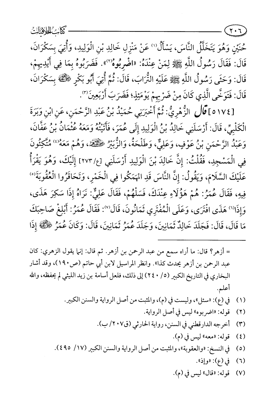 [5174] قال الزُّهْرِيُّ: ثُمَّ أَخْبَرَنِي حُمَيْدُ بْنُ عَبْدِ الرَّحْمَنِ، عَنِ ابْنِ وَبَرَةَ الْكَلْبِيِّ، قَالَ: أَرْسَلَنِي خَالِدُ بْنُ الْوَلِيدِ إِلَى عُمَرَ، فَأَتَيْتُهُ وَمَعَهُ عُثْمَانُ بْنُ عَفَّانَ، وَعَبْدُ الرَّحْمَنِ بْنُ عَوْفٍ، وَعَلِيٌّ، وَطَلْحَةُ، وَالزُّبَيْرُ - رضي الله عنهم -، وَهُمْ مَعَهُ (¬4) مُتَّكِئُونَ فِي الْمَسْجِدِ، فَقُلْتُ: إِنَّ خَالِدَ بْنَ الْوَلِيدِ أَرْسَلَنِي إِلَيْكَ، وَهُوَ يَقْرَأُ عَلَيْكَ السَّلَامَ، وَيَقُولُ: إِنَّ النَّاسَ قَدِ انْهَمَكُوا فِي الْخَمْرِ، وَتَحَاقَرُوا الْعُقُوبَةَ (¬5) فِيهِ، فَقَالَ عُمَرُ: هُمْ هَؤُلَاءِ عِنْدَكَ، فَسَلْهُمْ، فَقَالَ عَلِيٌّ: نَرَاهُ إِذَا سَكِرَ هَذَى، وَإِذَا (¬6) هَذَى افْتَرَى، وَعَلَى الْمُفْتَرِي ثَمَانُونَ، قَالَ (¬7): فَقَالَ عُمَرُ: أَبْلِغْ صَاحِبَكَ مَا قَالَ، قَالَ: فَجَلَدَ خَالِدٌ ثَمَانِينَ، وَجَلَدَ عُمَرُ ثَمَانِينَ، قَالَ: وَكَانَ عُمَرُ - رضي الله عنه - إِذَا