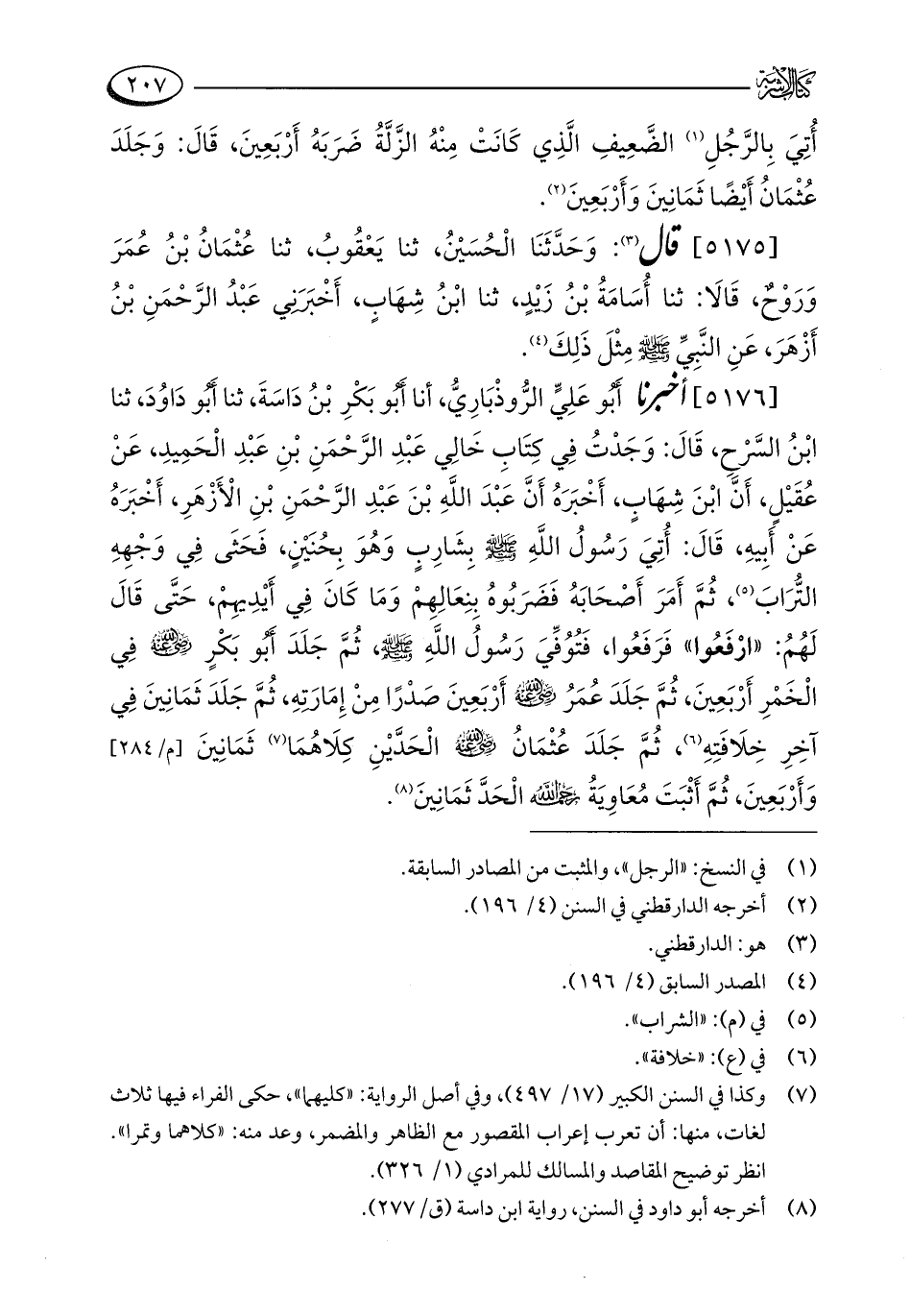 [5176] أخبرنا أبُو عَلِيٍّ الرُّوذْبَارِيُّ، أنا أَبُو بَكْرِ بْنُ دَاسَةَ، ثنا أَبُو دَاوُدَ، ثنا ابْنُ السَّرْحِ، قَالَ: وَجَدْتُ فِي كِتَابِ خَالِي عَبْدِ الرَّحْمَنِ بْنِ عَبْدِ الْحَمِيدِ، عَنْ عُقَيْلٍ، أَنَّ ابْنَ شِهَابٍ، أَخْبَرَهُ أَنَّ عَبْدَ اللَّهِ بْنَ عَبْدِ الرَّحْمَنِ بْنِ الْأَزْهَرِ، أَخْبَرَهُ عَنْ أَبِيهِ، قَالَ: أُتِيَ رَسُولُ اللَّهِ - صلى الله عليه وسلم - بِشَارِبٍ وَهُوَ بِحُنَيْنٍ، فَحَثَى فِي وَجْهِهِ التُّرَابَ (¬5)، ثُمَّ أَمَرَ أَصْحَابَهُ فَضَرَبُوهُ بِنِعَالِهِمْ وَمَا كَانَ فِي أَيْدِيهِمْ، حَتَّى قَالَ لَهُمُ: "ارْفَعُوا" فَرَفَعُوا، فَتُوُفِّيَ رَسُولُ اللَّهِ - صلى الله عليه وسلم -، ثُمَّ جَلَدَ أَبُو بَكْرٍ - رضي الله عنه - فِي الْخَمْرِ أَرْبَعِينَ، ثُمَّ جَلَدَ عُمَرُ - رضي الله عنه - أَرْبَعِينَ صَدْرًا مِنْ إِمَارَتِهِ، ثُمَّ جَلَدَ ثَمَانِينَ فِي آخِرِ خِلَافَتِهِ (¬6)، ثُمَّ جَلَدَ عُثْمَانُ - رضي الله عنه - الْحَدَّيْنِ كِلَاهُمَا (¬7) ثَمَانِينَ وَأَرْبَعِينَ، ثُمَّ أَثْبَتَ مُعَاوِيَةُ - رحمه الله - الْحَدَّ ثَمَانِينَ (¬8).