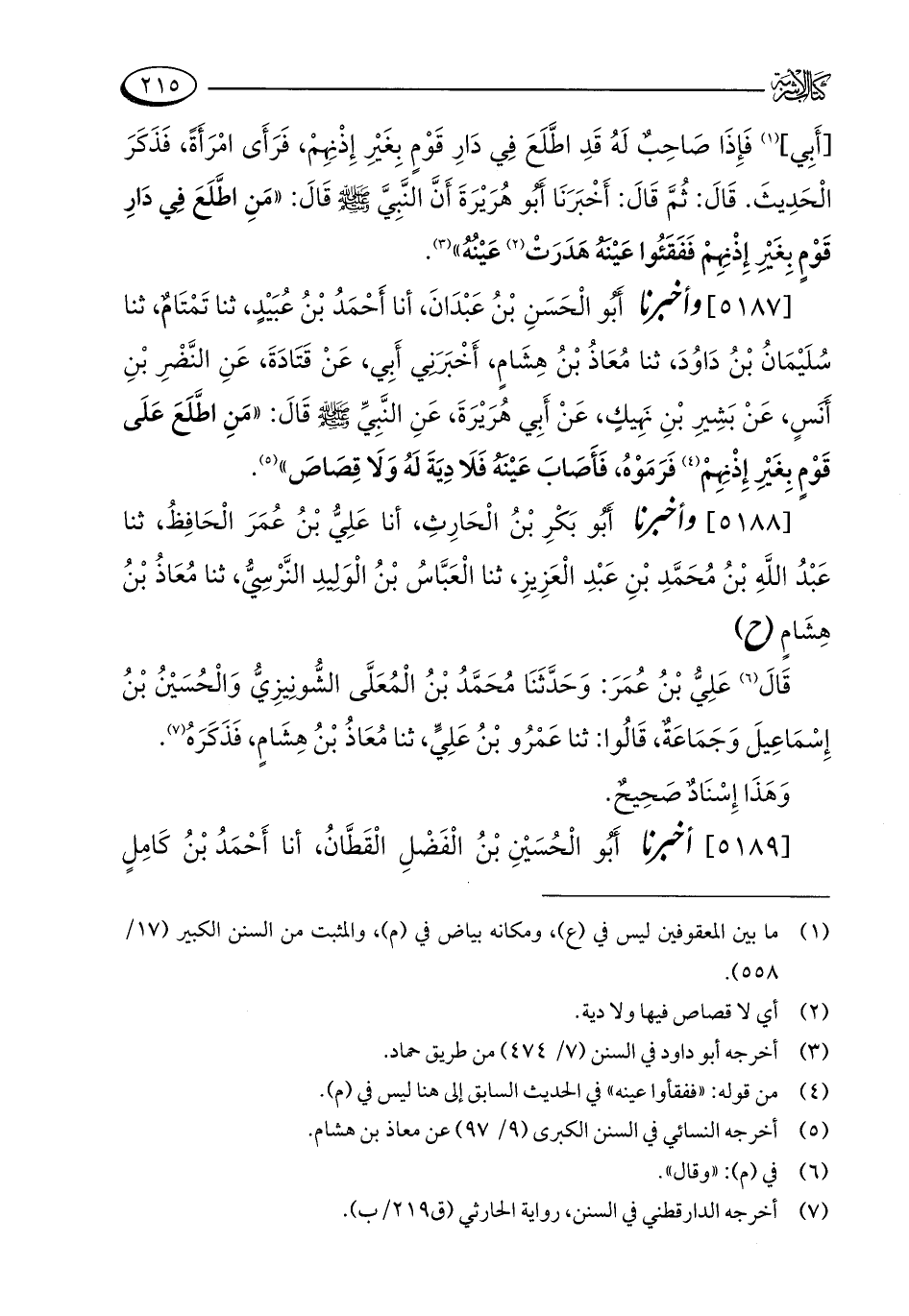 [5187] وأخبرنا أبُو الْحَسَنِ بْنُ عَبْدَانَ، أنا أَحْمَدُ بْنُ عُبَيْدٍ، ثنا تَمْتَامٌ، ثنا سُلَيْمَانُ بْنُ دَاوُدَ، ثنا مُعَاذُ بْنُ هِشَامٍ، أَخْبَرَنِي أَبِي، عَنْ قَتَادَةَ، عَنِ النَّضْرِ بْنِ أَنَسٍ، عَنْ بَشِيرِ بْنِ نَهِيكٍ، عَنْ أَبِي هُرَيْرَةَ، عَنِ النَّبِيِّ - صلى الله عليه وسلم - قالَ: "مَنِ اطَّلَعَ عَلَى قَوْمٍ بِغَيْرِ إِذْنِهِم (¬4) فَرَمَوْهُ، فَأَصَابَ عَيْنَهُ فَلَا دِيَةَ لَهُ وَلَا قِصَاصَ" (¬5).
