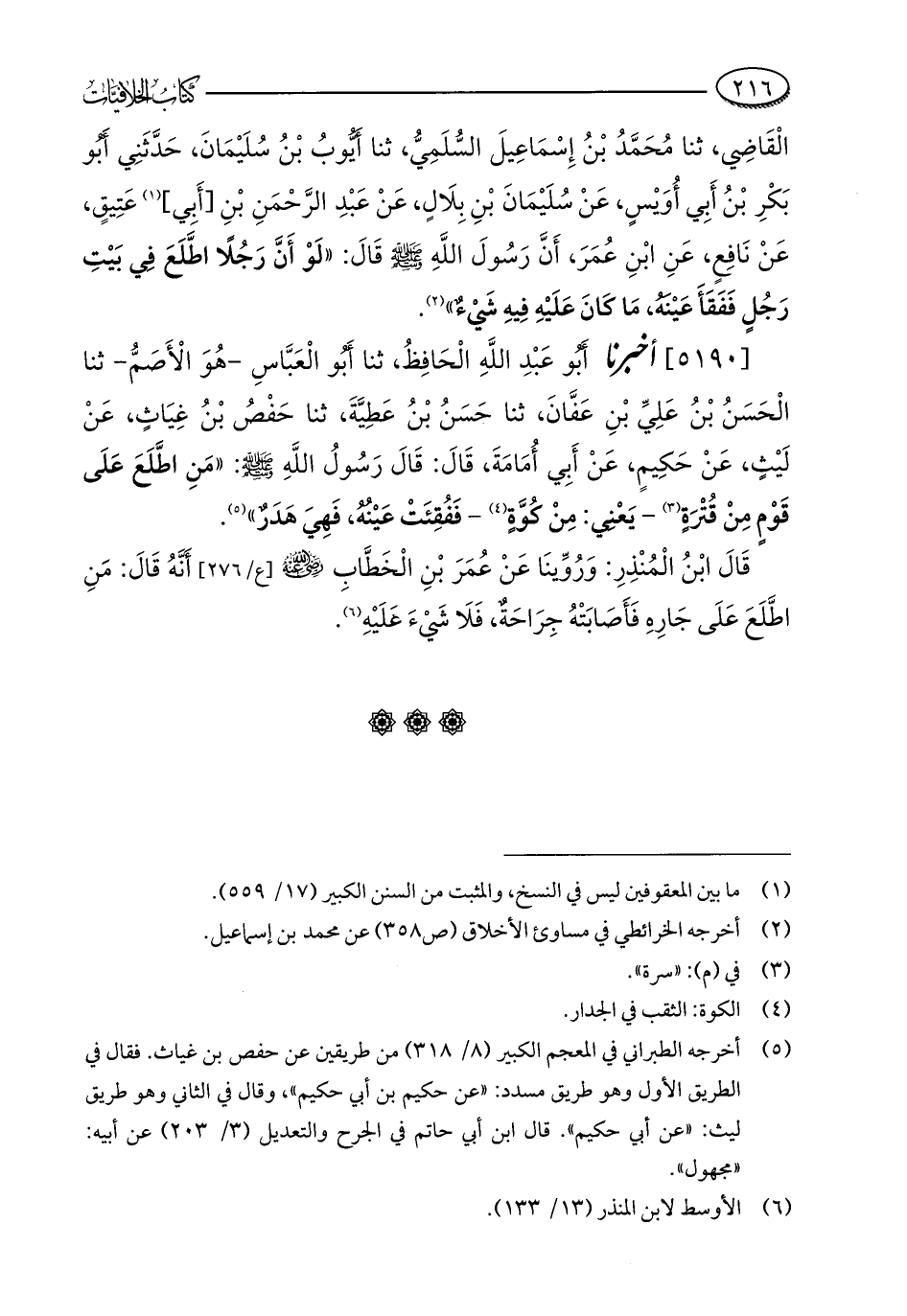 [5190] أخبرنا أبُو عَبْدِ اللَّهِ الْحَافِظُ، ثنا أبُو الْعَبَّاسِ - هُوَ الْأَصَمُّ - ثنا الْحَسَنُ بْنُ عَلِيِّ بْنِ عَفَّانَ، ثنا حَسَنُ بْنُ عَطِيَّةَ، ثنا حَفْصُ بْنُ غِيَاثٍ، عَنْ لَيْثٍ، عَنْ حَكِيمٍ، عَنْ أَبِي أُمَامَةَ، قَالَ: قَالَ رَسُولُ اللَّهِ - صلى الله عليه وسلم -: "مَنِ اطَّلَعَ عَلَى قَوْمٍ مِنْ قُتْرَةٍ (¬3) - يَعْنِي: مِنْ كُوَّةٍ (¬4) - فَفُقِئَتْ عَيْنُهُ، فَهِيَ هَدَرٌ" (¬5).