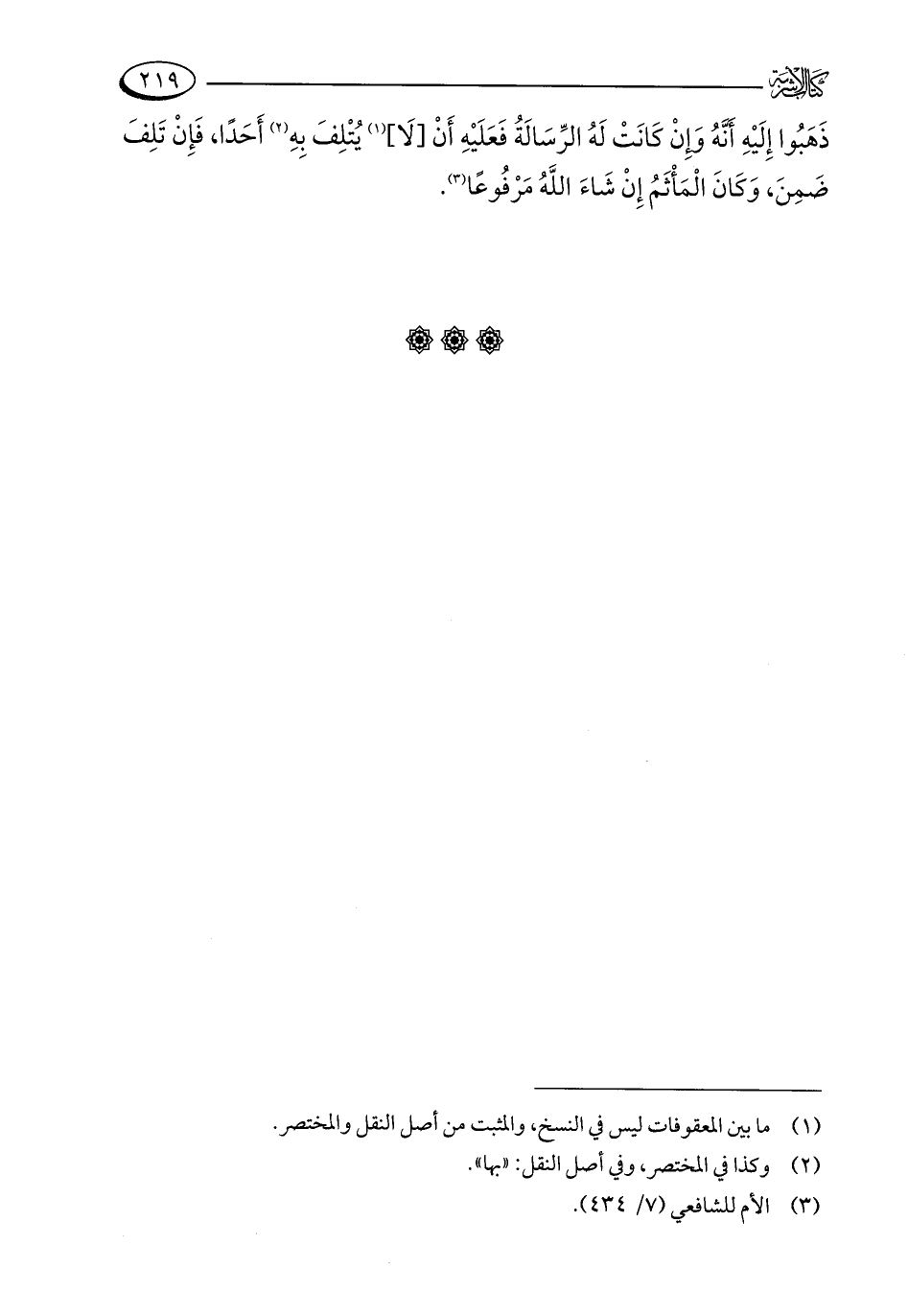 ذَهَبُوا إِلَيْهِ أَنَّهُ وَإِنْ كَانَتْ لَهُ الرِّسَالَةُ فَعَلَيْهِ أَنْ [لَا] (¬1) يُتْلِفَ بِهِ (¬2) أَحَدًا، فَإِنْ تَلِفَ ضَمِنَ، وَكَانَ الْمَأْثَمُ إِنْ شَاءَ اللَّهُ مَرْفُوعًا (¬3).