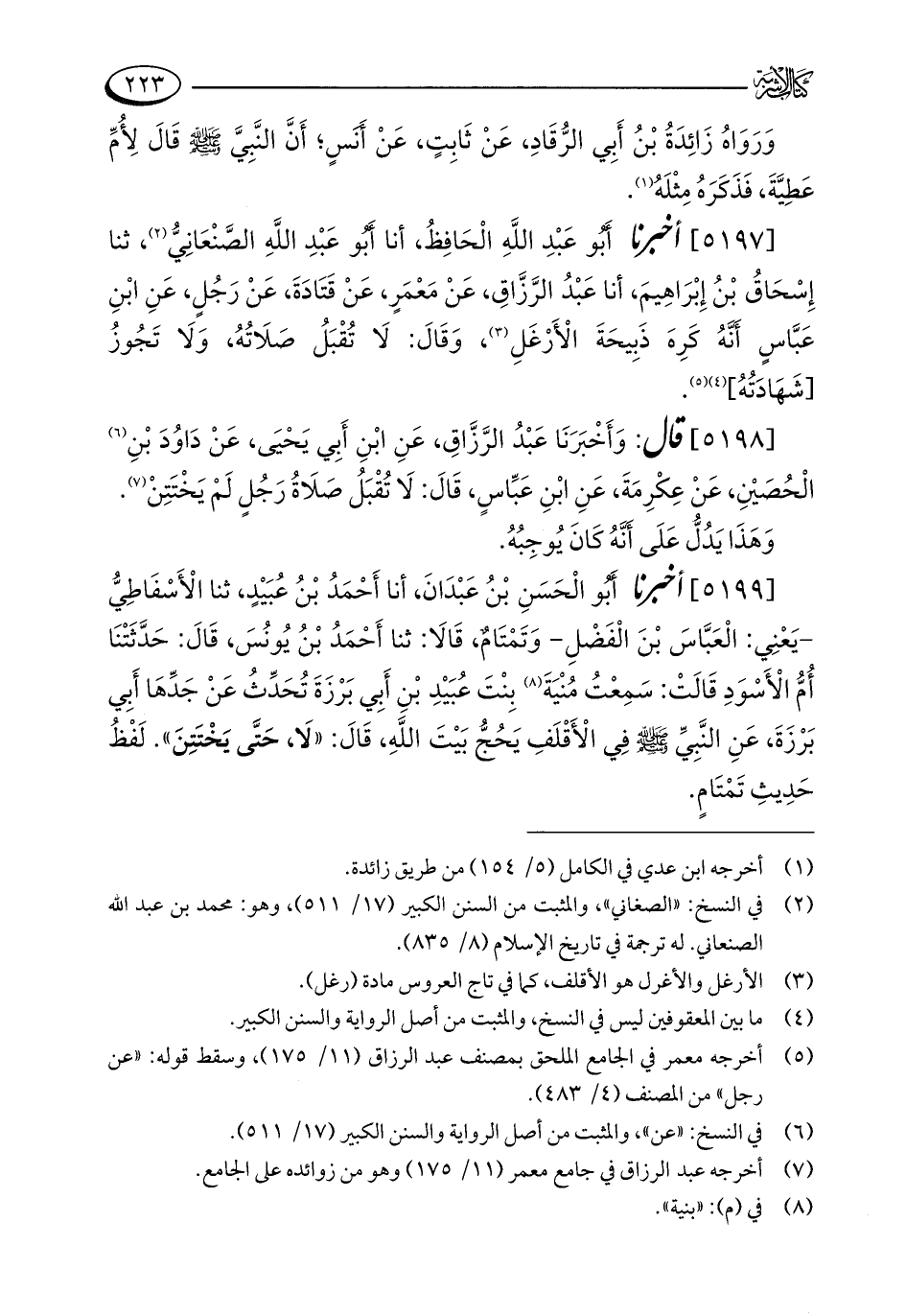 [5199] أخبرنا أبُو الْحَسَنِ بْنُ عَبْدَانَ، أنا أَحْمَدُ بْنُ عُبَيْدٍ، ثنا الْأَسْفَاطِيُّ - يَعْنِي: الْعَبَّاسَ بْنَ الْفَضْلِ - وَتَمْتَامٌ، قَالَا: ثنا أَحْمَدُ بْنُ يُونُسَ، قَالَ: حَدَّثَتْنَا أُمُّ الْأَسْوَدِ قَالَتْ: سَمِعْتُ مُنْيَةَ (¬8) بِنْتَ عُبَيْدِ بْنِ أَبِي بَرْزَةَ تُحَدِّثُ عَنْ جَدِّهَا أَبِي بَرْزَةَ، عَنِ النَّبِيِّ - صلى الله عليه وسلم - فِي الْأَقْلَفِ يَحُجُّ بَيْتَ اللَّهِ، قَالَ: "لَا، حَتَّى يَخْتَتِنَ". لَفْظُ حَدِيثِ تَمْتَامٍ.