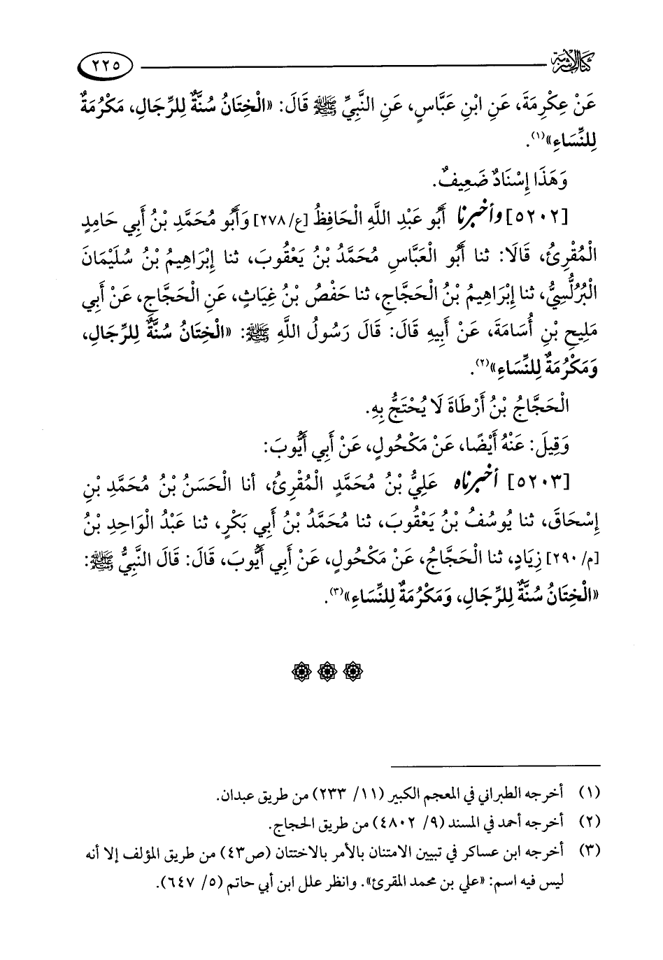(¬3) أخرجه ابن عساكر في تبيين الامتنان بالأمر بالاختتان (ص 43) من طريق المؤلف إلا أنه ليس فيه اسم: "علي بن محمد المقرئ". وانظر علل ابن أبي حاتم (5/ 647).