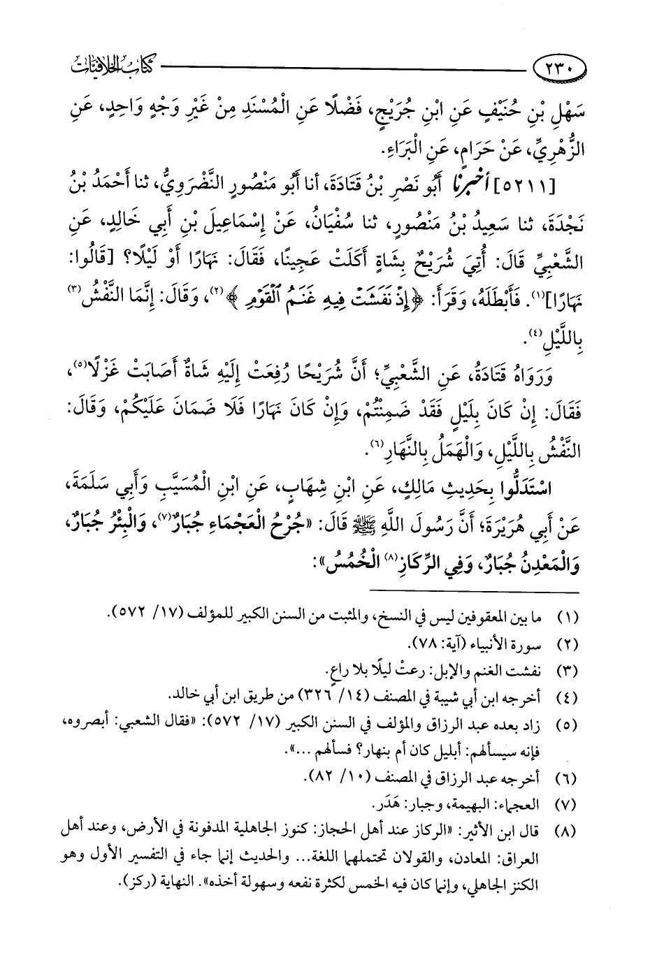 [5211] أخبرنا أَبُو نَصْرِ بْنُ قَتَادَةَ، أنا أَبُو مَنْصُورٍ النَّضْرَوِيُّ، ثنا أَحْمَدُ بْنُ نَجْدَةَ، ثنا سَعِيدُ بْنُ مَنْصُورٍ، ثنا سُفْيَانُ، عَنْ إِسْمَاعِيلَ بْنِ أَبِي خَالِدٍ، عَنِ الشَّعْبِيِّ قَالَ: أُتِيَ شُرَيْحٌ بِشَاةٍ أَكَلَتْ عَجِينًا، فَقَالَ: نَهَارًا أَوْ لَيْلًا؟ [قَالُوا: نَهَارًا] (¬1). فَأَبْطَلَهُ، وَقَرَأَ: {إِذْ نَفَشَتْ فِيهِ غَنَمُ الْقَوْمِ} (¬2)، وَقَالَ: إِنَّمَا النَّفْشُ (¬3) بِاللَّيْلِ (¬4).