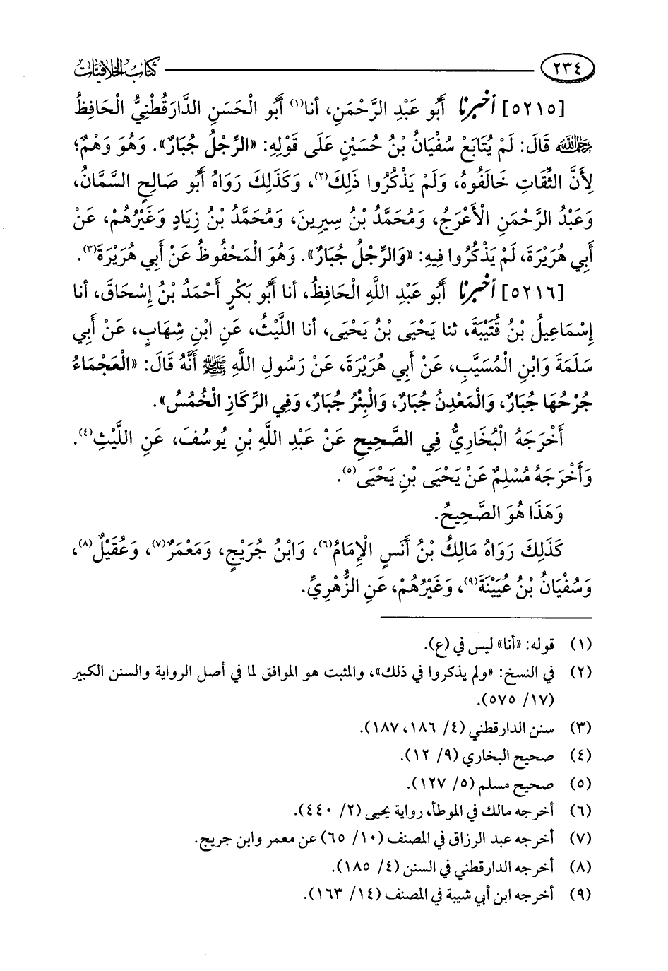 [5215] أخبرنا أبُو عَبْدِ الرَّحْمَنِ، أنا (¬1) أَبُو الْحَسَنِ الدَّارَقُطْنِيُّ الْحَافِظُ - رحمه الله - قَالَ: لَمْ يُتَابَعْ سُفْيَانُ بْنُ حُسَيْنٍ عَلَى قَوْلِهِ: "الرِّجْلُ جُبَارٌ". وَهُوَ وَهْمٌ؛ لِأَنَّ الثِّقَاتِ خَالَفُوهُ، وَلَمْ يَذْكُرُوا ذَلِكَ (¬2)، وَكَذَلِكَ رَوَاهُ أبُو صَالِحٍ السَّمَّانُ، وَعَبْدُ الرَّحْمَنِ الْأَعْرَجُ، وَمُحَمَّدُ بْنُ سِيرِينَ، وَمُحَمَّدُ بْنُ زِيَادٍ وَغَيْرُهُمْ، عَنْ أَبِي هُرَيْرَةَ، لَمْ يَذْكُرُوا فِيهِ: "وَالرِّجْلُ جُبَارٌ". وَهُوَ الْمَحْفُوظُ عَنْ أَبِي هُرَيْرَةَ (¬3).