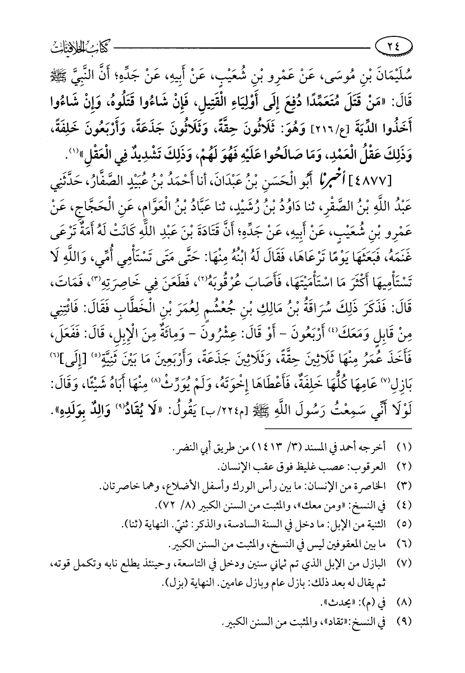 [4877] أخبرنا أَبُو الْحَسَنِ بْنُ عَبْدَانَ، أنا أَحْمَدُ بْنُ عُبَيْدٍ الصَّفَّارُ، حَدَّثَنِي عَبْدُ اللَّهِ بْنُ الصَّقْرِ، ثنا دَاوُدُ بْنُ رُشَيْدٍ، ثنا عَبَّادُ بْنُ الْعَوَّامِ، عَنِ الْحَجَّاجِ، عَنْ عَمْرِو بْنِ شُعَيْبٍ، عَنْ أَبِيهِ، عَنْ جَدِّهِ؛ أَنَّ قَتَادَةَ بْنَ عَبْدِ اللَّهِ كَانَتْ لَهُ أَمَةٌ تَرْعَى غَنَمَهُ، فَبَعَثَهَا يَوْمًا تَرْعَاهَا، فَقَالَ لَهُ ابْنُهُ مِنْهَا: حَتَّى مَتَى تَسْتَأْمِي أُمِّي، وَاللَّهِ لَا تَسْتَأْمِيهَا أَكْثَرَ مَا اسْتَأْمَيْتَهَا، فَأَصَابَ عُرْقُوبَهُ (¬2)، فَطَعَنَ فِي خَاصِرَتِهِ (¬3)، فَمَاتَ، قَالَ: فَذَكَرَ ذَلِكَ سُرَاقَةُ بْنُ مَالِكِ بْنِ جُعْشُمٍ لِعُمَرَ بْنِ الْخَطَّابِ فَقَالَ: فَائْتِنِي مِنْ قَابِلٍ وَمَعَكَ (¬4) أَرْبَعُونَ - أَوْ قَالَ: عِشْرُونَ - وَمِائَةٌ مِنَ الْإِبِلِ، قَالَ: فَفَعَلَ، فَأَخَذَ عُمَرُ مِنْهَا ثَلَاثِينَ حِقَّةً، وَثَلَاثِينَ جَذَعَةً، وَأَرْبَعِينَ مَا بَيْنَ ثَنِيَّةٍ (¬5) [إِلَى] (¬6) بَازِلِ (¬7) عَامِهَا كُلُّهَا خَلِفَةٌ، فَأَعْطَاهَا إِخْوَتَهُ، وَلَمْ يُوَرِّثْ (¬8) مِنْهَا أَبَاهُ شَيْئًا، وَقَالَ: لَوْلَا أَنِّي سَمِعْتُ رَسُولَ اللَّهِ - صلى الله عليه وسلم - يَقُولُ: "لَا يُقَادُ (¬9) وَالِدٌ بِوَلَدِهِ".