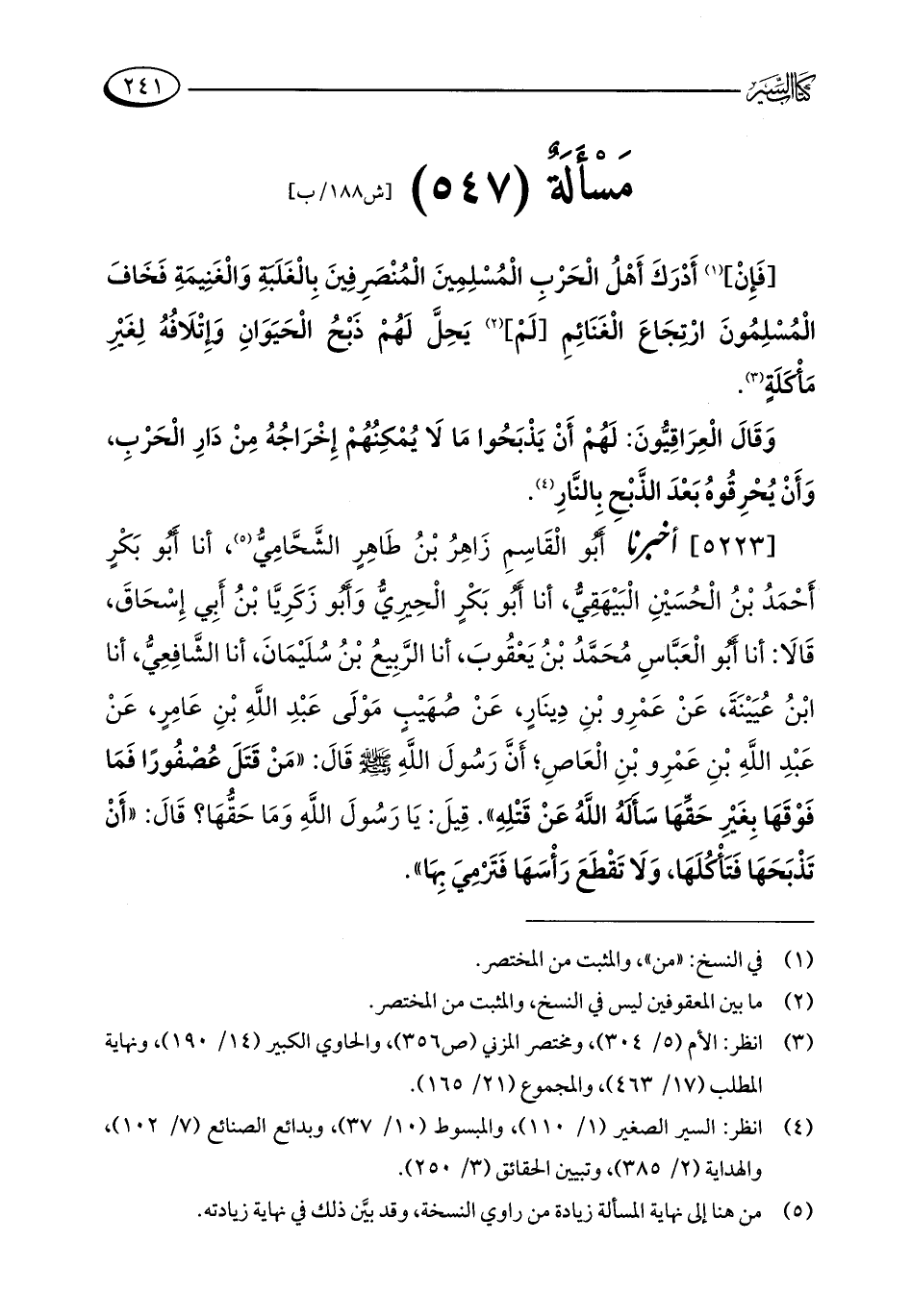 (¬4) انظر: السير الصغير (1/ 110)، والمبسوط (10/ 37)، وبدائع الصنائع (7/ 102)، والهداية (2/ 385)، وتبيين الحقائق (3/ 250).
