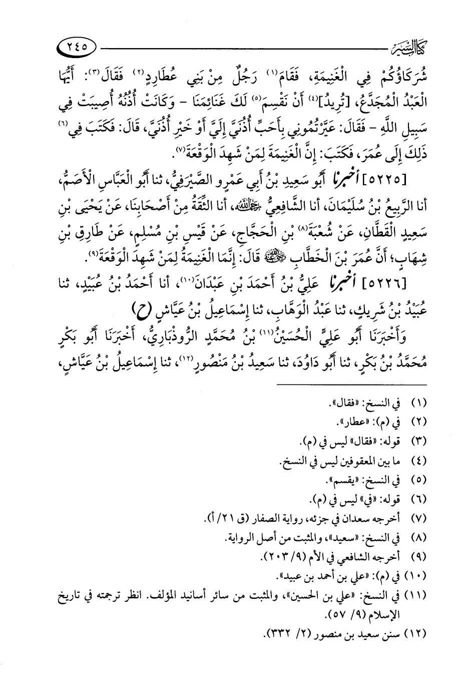 [5225] أخبرنا أَبُو سَعِيدِ بْنُ أَبِي عَمْرٍو الصَّيْرَفِيُّ، ثنا أَبُو الْعَبَّاسِ الْأَصَمُّ، أنا الرَّبِيعُ بْنُ سُلَيْمَانَ، أنا الشَّافِعِيُّ - رحمه الله -، أنا الثِّقَةُ مِنْ أَصْحَابِنَا، عَنْ يَحْيَى بْنِ سَعِيدٍ الْقَطَّانِ، عَنْ شُعْبَةَ (¬8) بْنِ الْحَجَّاجِ، عَنْ قَيْسِ بْنِ مُسْلِمٍ، عَنْ طَارِقِ بْنِ شِهَابٍ؛ أَنَّ عُمَرَ بْنَ الْخَطَّابِ - رضي الله عنه - قَالَ: إِنَّمَا الْغَنِيمَةُ لِمَنْ شَهِدَ الْوَقْعَةَ (¬9).