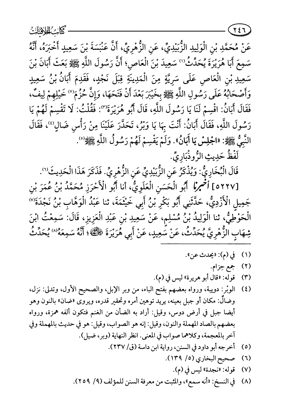 عَنْ مُحَمَّدِ بْنِ الْوَلِيدِ الزُّبَيْدِيِّ، عَنِ الزُّهْرِيِّ، أَنَّ عَنْبَسَةَ بْنَ سَعِيدٍ أَخْبَرَهُ، أَنَّهُ سَمِعَ أَبا هُرَيْرَةَ يُحَدِّثُ (¬1) سَعِيدَ بْنَ الْعَاصِ؛ أَنَّ رَسُولَ اللَّهِ - صلى الله عليه وسلم - بَعَثَ أَبَانَ بْنَ سَعِيدِ بْنِ الْعَاصِ عَلَى سَرِيَّةٍ مِنَ الْمَدِينَةِ قِبَلَ نَجْدٍ، فَقَدِمَ أبَانُ بْنُ سَعِيدٍ وَأَصْحَابُهُ عَلَى رَسُولِ اللَّهِ - صلى الله عليه وسلم - بِخَيْبَرَ بَعْدَ أَنْ فَتَحَهَا، وَإِنَّ حُزُمَ (¬2) خَيْلِهِمْ لِيِفٌ، فَقَالَ أَبَانُ: اقْسِمْ لَنَا يَا رَسُولَ اللَّهِ، قَالَ أبُو هُرَيْرَةَ (¬3): فَقُلْتُ: لَا تَقْسِمْ لَهُمْ يَا رَسُولَ اللَّهِ، فَقَالَ أبَانُ: أَنْتَ بِهَا يَا وَبْرُ، تَحَدَّرَ عَلَيْنَا مِنْ رَأْسِ ضَالٍ (¬4)، فَقَالَ النَّبِيُّ - صلى الله عليه وسلم -: "اجْلِسْ يَا أَبَانُ". وَلَمْ يَقْسِمْ لَهُمْ رَسُولُ اللَّهِ - صلى الله عليه وسلم - (¬5).