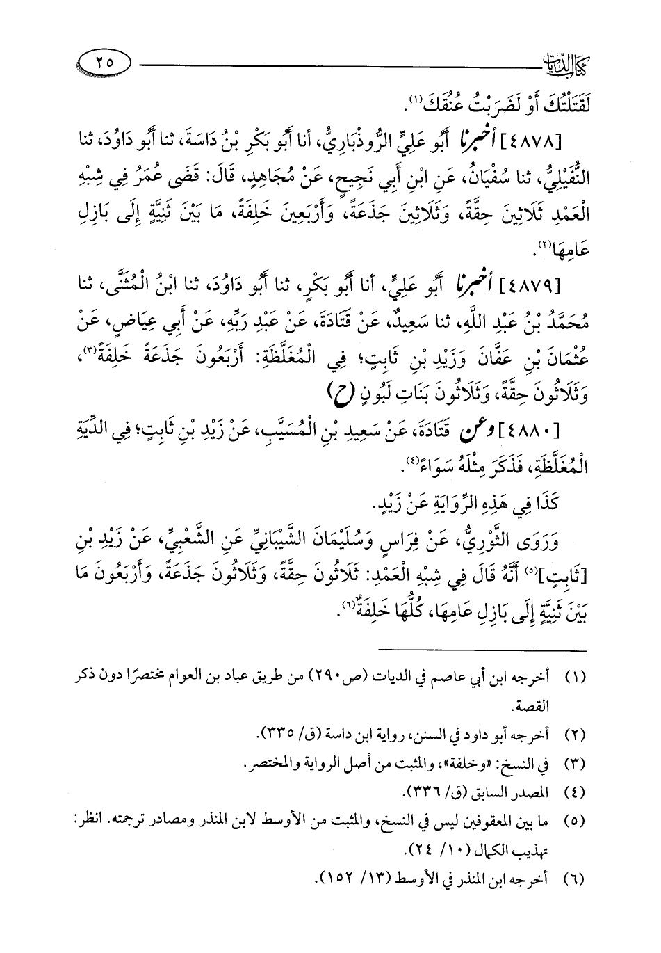 [4878] أخبرنا أَبُو عَلِيٍّ الرُّوذْبَارِيُّ، أنا أَبُو بَكْرِ بْنُ دَاسَةَ، ثنا أَبُو دَاوُدَ، ثنا النُّفَيْلِيُّ، ثنا سُفْيَانُ، عَنِ ابْنِ أَبِي نَجِيحٍ، عَنْ مُجَاهِدٍ، قَالَ: قَضَى عُمَرُ فِي شِبْهِ الْعَمْدِ ثَلَاثِينَ حِقَّةً، وَثَلَاثِينَ جَذَعَةً، وَأَرْبَعِينَ خَلِفَةً، مَا بَيْنَ ثَنِيَّةٍ إِلَى بَازِلِ عَامِهَا (¬2).