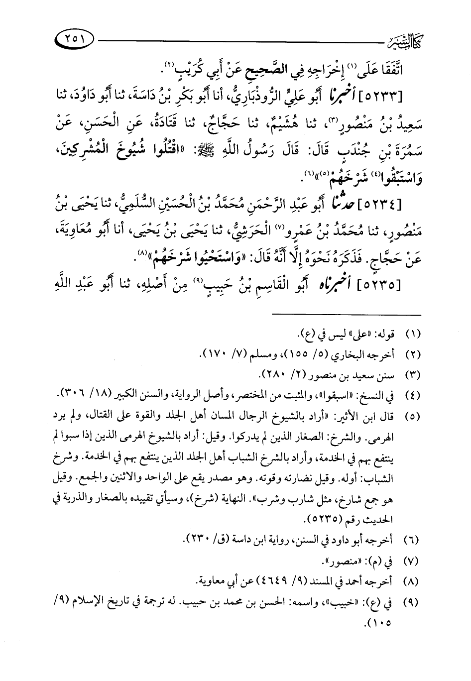 [5234] حدثنا أَبُو عَبْدِ الرَّحْمَنِ مُحَمَّدُ بْنُ الحُسَيْنِ السُّلَمِيُّ، ثنا يَحْيَى بْن مَنْصُورٍ، ثنا مُحَمَّدُ بْنُ عَمْرٍو (¬7) الْحَرَشِيُّ، ثنا يَحْيَى بْنُ يَحْيَى، أنا أَبُو مُعَاوِيَةَ، عَنْ حَجَّاجٍ. فَذَكَرَهُ نَحْوَهُ إِلَّا أَنَّهُ قَالَ: "وَاسْتَحْيُوا شَرْخَهُمْ" (¬8).