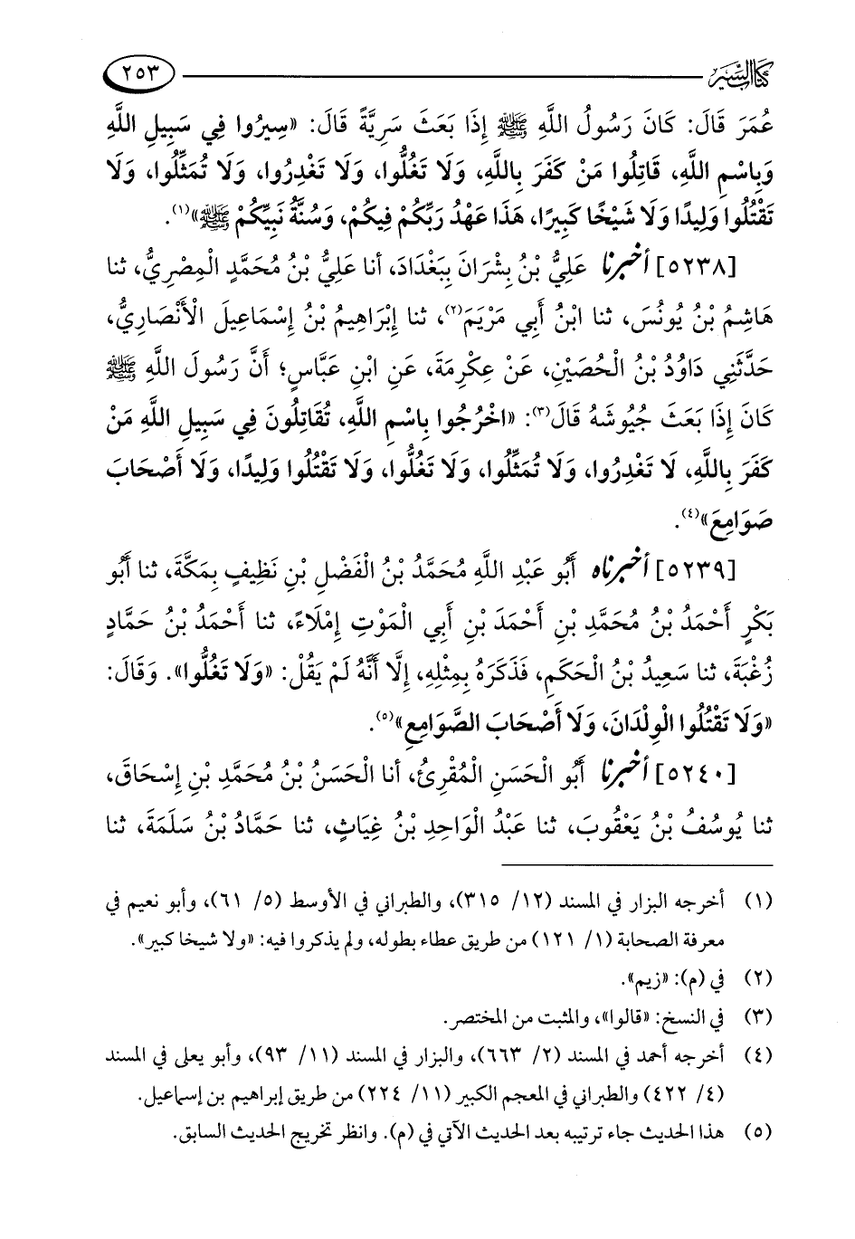 [5239] أخبرناه أَبُو عَبْدِ اللَّهِ مُحَمَّدُ بْنُ الْفَضْلِ بْنِ نَظِيفٍ بِمَكَّةَ، ثنا أَبُو بَكْرٍ أَحْمَدُ بْنُ مُحَمَّدِ بْنِ أَحْمَدَ بْنِ أَبِي الْمَوْتِ إِمْلَاءً، ثنا أَحْمَدُ بْنُ حَمَّادٍ زُغْبَةَ، ثنا سَعِيدُ بْنُ الْحَكَمِ، فَذَكَرَهُ بِمِثْلِهِ، إِلَّا أَنَّهُ لَمْ يَقُلْ: "وَلَا تَغُلُّوا". وَقَالَ: "وَلَا تَقْتُلُوا الْوِلْدَانَ، وَلَا أَصْحَابَ الصَّوَامِعِ" (¬5).