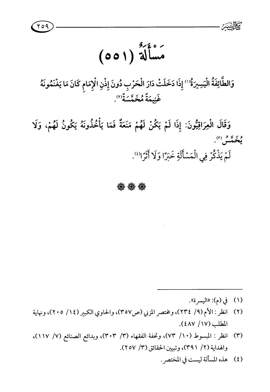 مَسْأَلَةٌ (551): وَالطَّائِفَةُ الْيَسِيرَةُ (¬1) إِذَا دَخَلَتْ دَارَ الْحَرْبِ دُونَ إِذْنِ الْإِمَامِ كَانَ مَا يَغْنَمُونَهُ غَنِيمَةً مُخَمَّسَةً (¬2).