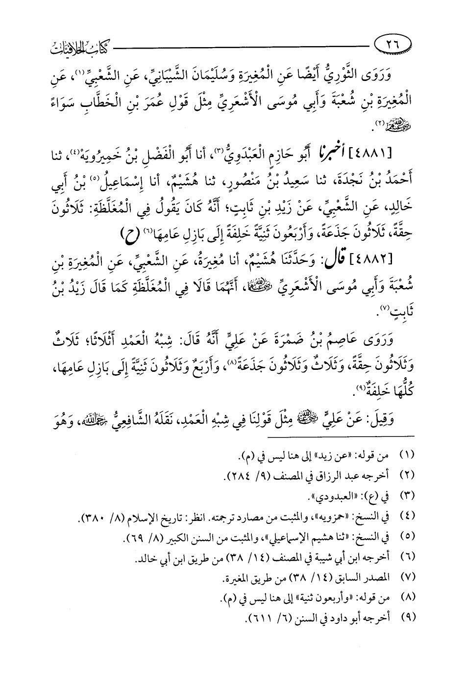 [4882] قال: وَحَدَّثَنَا هُشَيْمٌ، أنا مُغِيرَةُ، عَنِ الشَّعْبِيِّ، عَنِ الْمُغِيرَةِ بْنِ شُعْبَةَ وَأَبِي مُوسَى الْأَشْعَرِيِّ - رضي الله عنهما -، أَنَّهُمَا قَالَا فِي الْمُغَلَّظَةِ كَمَا قَالَ زَيْدُ بْنُ ثَابِتٍ (¬7).