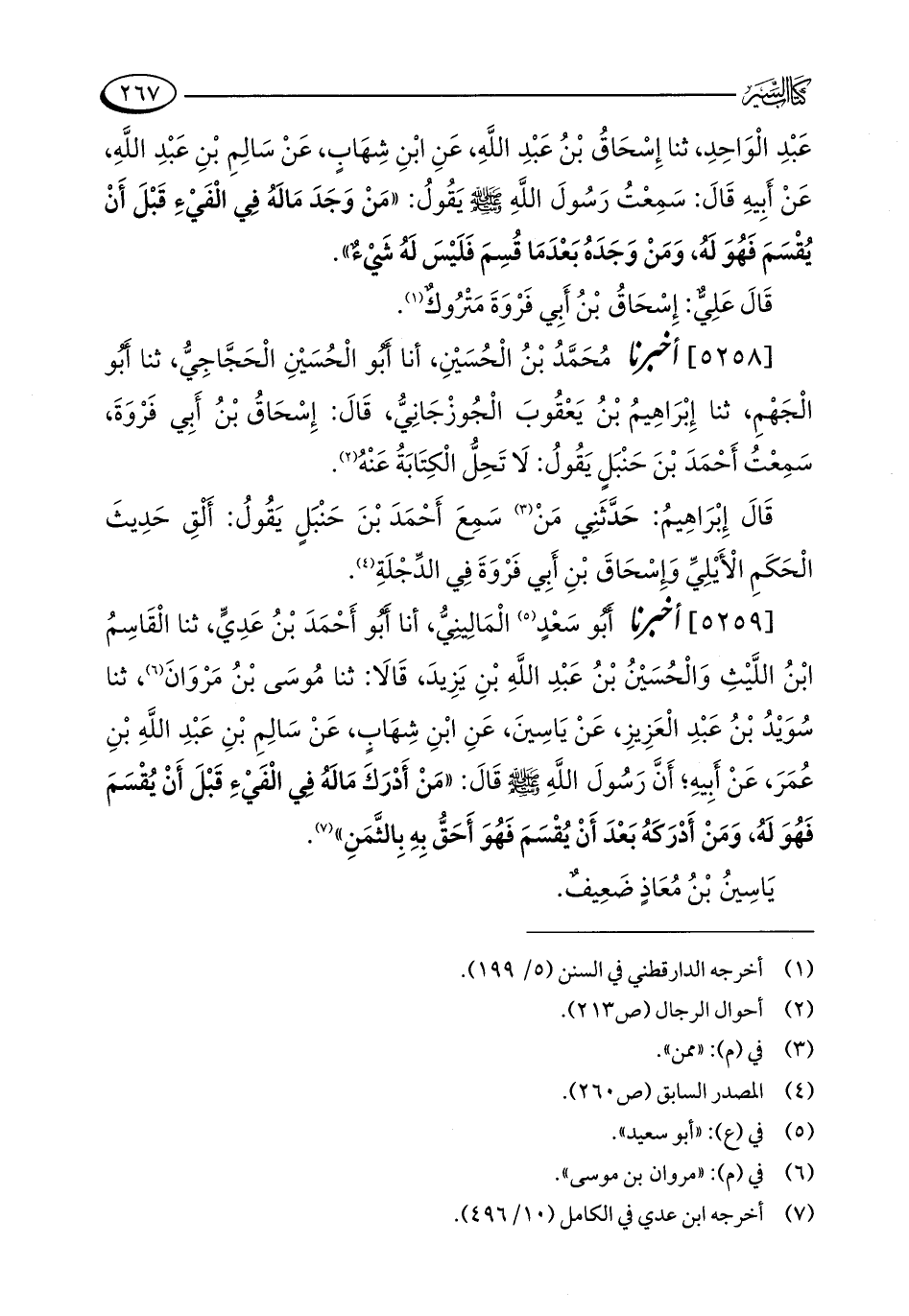[5259] أخبرنا أَبُو سَعْدٍ (¬5) الْمَالِينِيُّ، أنا أَبُو أَحْمَدَ بْنُ عَدِيٍّ، ثنا الْقَاسِمُ بْنُ اللَّيْثِ وَالْحُسَيْنُ بْنُ عَبْدِ اللَّهِ بْنِ يَزِيدَ، قَالَا: ثنا مُوسَى بْنُ مَرْوَانَ (¬6)، ثنا سُوَيْدُ بْنُ عَبْدِ الْعَزِيزِ، عَنْ يَاسِينَ، عَنِ ابْنِ شِهَابٍ، عَنْ سَالِمِ بْنِ عَبْدِ اللَّهِ بْنِ عُمَرَ، عَنْ أَبِيهِ؛ أَنَّ رَسُولَ اللَّهِ - صلى الله عليه وسلم - قَالَ: "مَنْ أَدْرَكَ مَالَهُ فِي الْفَيْءِ قَبْلَ أَنْ يُقْسَمَ فَهُوَ لَهُ، وَمَنْ أَدْرَكَهُ بَعْدَ أَنْ يُقْسَمَ فَهُوَ أَحَقُّ بِهِ بِالثَّمَنِ" (¬7).