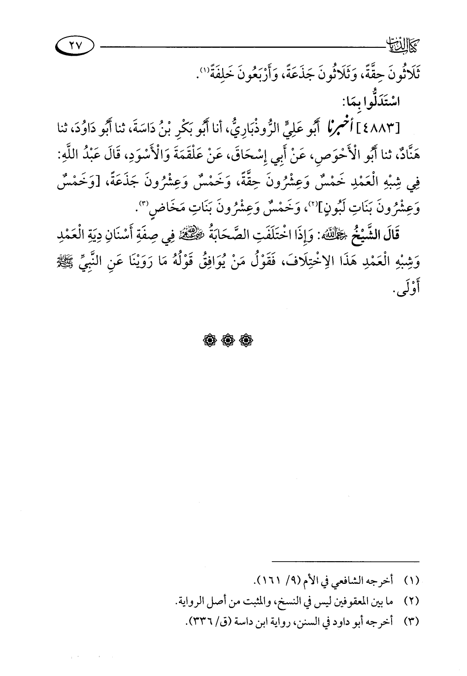 [4883] أخبرنا أَبُو عَلِيٍّ الرُّوذْبَارِيُّ، أنا أَبُو بَكْرِ بْنُ دَاسَةَ، ثنا أَبُو دَاوُدَ، ثنا هَنَّادٌ، ثنا أَبُو الْأَحْوَصِ، عَنْ أَبِي إِسْحَاقَ، عَنْ عَلْقَمَةَ وَالْأَسْوَدِ، قَالَ عَبْدُ اللَّهِ: فِي شِبْهِ الْعَمْدِ خَمْسٌ وَعِشْرُونَ حِقَّةً، وَخَمْسٌ وَعِشْرُونَ جَذَعَةً، [وَخَمْسٌ وَعِشْرُونَ بَنَاتِ لَبُونٍ] (¬2)، وَخَمْسٌ وَعِشْرُونَ بَنَاتِ مَخَاضٍ (¬3).