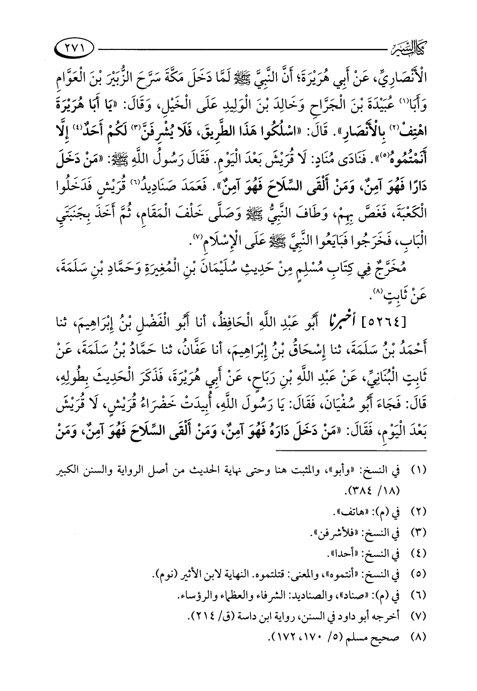 [5264] أخبرنا أَبُو عَبْدِ اللَّهِ الْحَافِظُ، أنا أَبُو الْفَضْلِ بْنُ إِبْرَاهِيمَ، ثنا أَحْمَدُ بْنُ سَلَمَةَ، ثنا إِسحَاقُ بْنُ إِبْرَاهِيمَ، أنا عَفَّانُ، ثنا حَمَّادُ بْنُ سَلَمَةَ، عَنْ ثَابِتٍ الْبُنَانِيِّ، عَنْ عَبْدِ اللَّهِ بْنِ رَبَاحٍ، عَنْ أَبِي هُرَيْرَةَ، فَذَكَرَ الْحَدِيثَ بِطُولِهِ، قَالَ: فَجَاءَ أَبُو سُفْيَانَ، فَقَالَ: يَا رَسُولَ اللَّهِ، أُبِيدَتْ خَضْرَاءُ قُرَيْشٍ، لَا قُرَيْشَ بَعْدَ الْيَوْمِ، فَقَالَ: "مَنْ دَخَلَ دَارَهُ فَهُوَ آمِنٌ، وَمَنْ أَلْقَى السِّلَاحَ فَهُوَ آمِنٌ، وَمَنْ