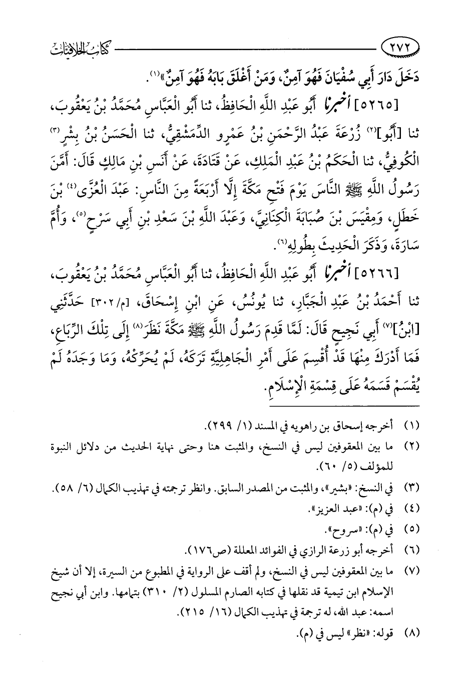 [5266] أخبرنا أَبُو عَبْدِ اللَّهِ الْحَافِظُ، ثنا أَبُو الْعَبَّاسِ مُحَمَّدُ بْنُ يَعْقُوبَ، ثنا أَحْمَدُ بْنُ عَبْدِ الْجَبَّارِ، ثنا يُونُسُ، عَنِ ابْنِ إِسْحَاقَ، حَدَّثَنِي [ابْنُ] (¬7) أَبِي نَجِيحٍ قَالَ: لَمَّا قَدِمَ رَسُولُ اللَّهِ - صلى الله عليه وسلم - مَكَّةَ نَظَرَ (¬8) إِلَى تِلْكَ الرِّبَاعِ، فَمَا أَدْرَكَ مِنْهَا قَدْ أُقْسِمَ عَلَى أَمْرِ الْجَاهِلِيَّةِ تَرَكَهُ، لَمْ يُحَرِّكْهُ، وَمَا وَجَدَهُ لَمْ يُقْسَمْ قَسَمَهُ عَلَى قِسْمَةِ الْإِسْلَامِ.